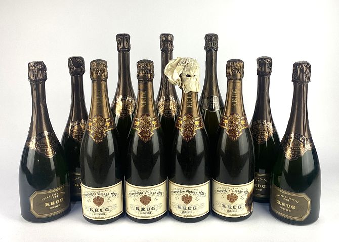 Champagne: Eleven bottles of Krug Vintage Champagne, six bottles of 1981 Vintage (6), a single bottle of 1979 Vinatge, four bottles of 1973 Vintage (4) ,