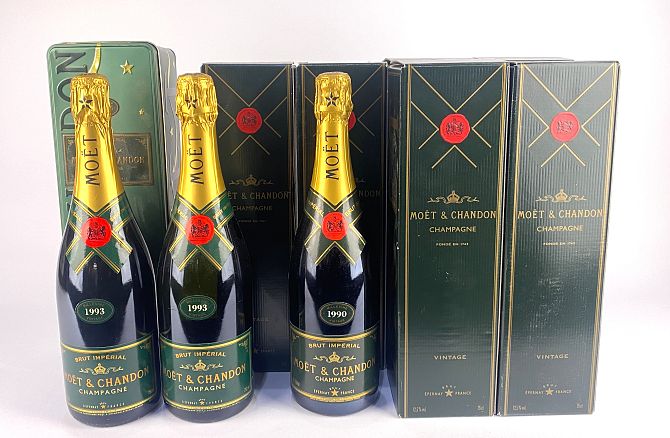 Champagne: Nine bottles of Moet & Chandon Brut Imperial Vintage Champagne, seven bottles of 1990 Vintage with branded cardboard boxes (one lacking box) (7), two bottles of 1993 Vintage with branded metal tin (one lacking tin) (2)
