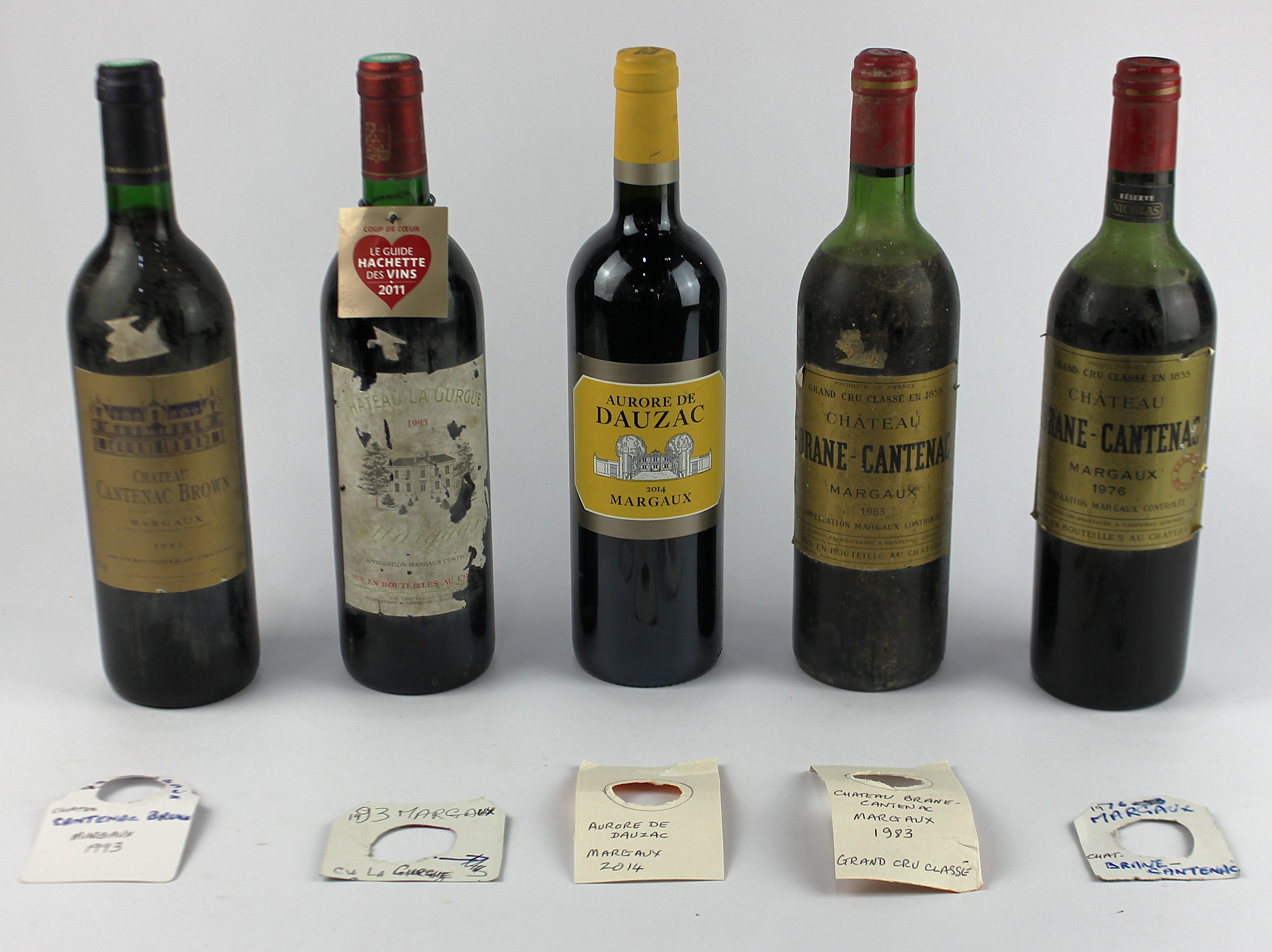 Fine Wine: A collection of five vintage bottles of Margaux, including; 1976 and 1983 Chateau Brane-Cantenac Grand Cru Classe, 1993 Chateau Cantenac Brown Grand Cru Classe, 1993 Chateau La Gurgue and 2014 Aurore De Dauzac, 73cl and 75cl (5)