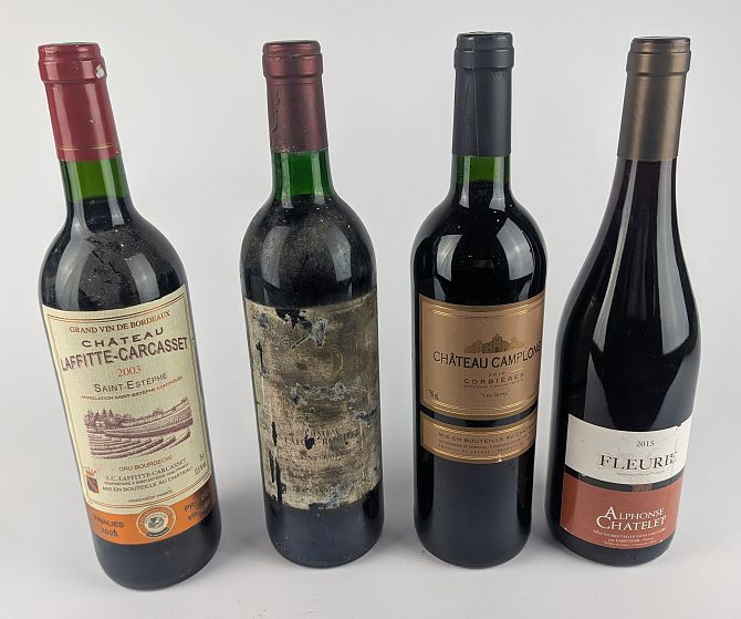 Fine Wine: A mixed collection of four vintage bottles of French red wine, including; Chateau Lafon-Roche Saint Esterile (label AF), 2003 Chateau Laffitte-Carcasset Saint Estephe, 2010 Chateau Camplong Corbieres and 2015 Alphonse Chatelet Fleurie (4)