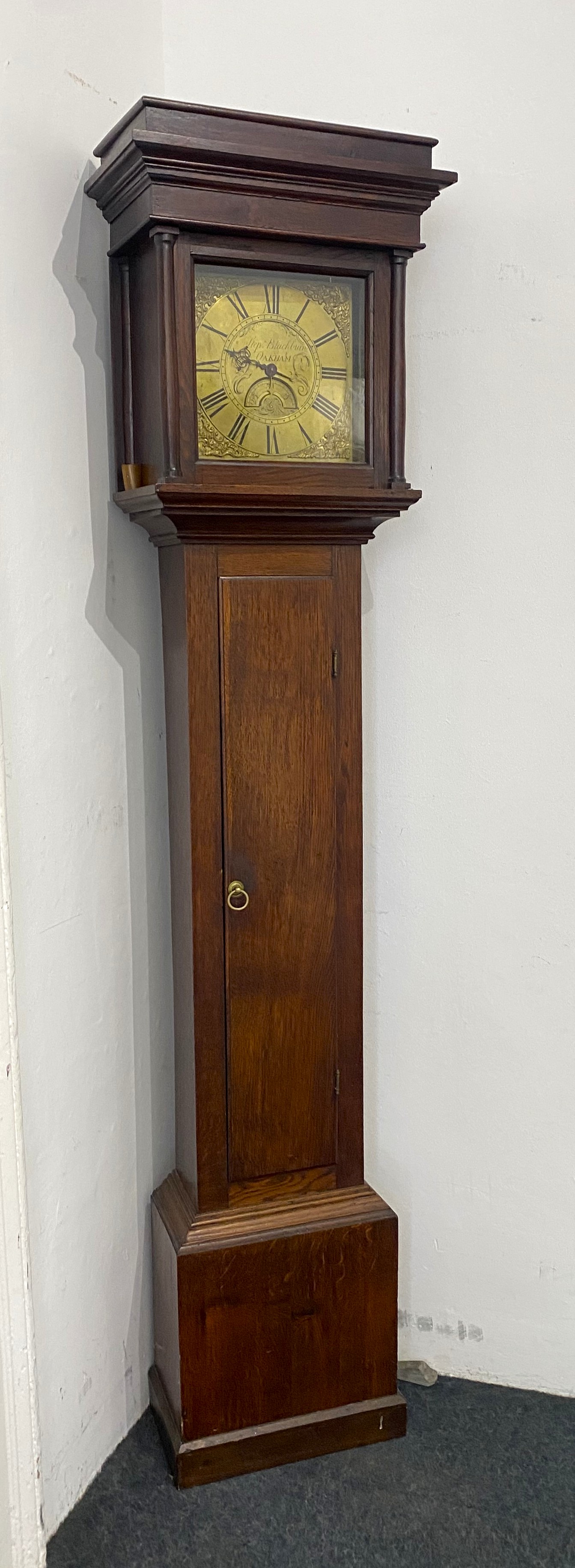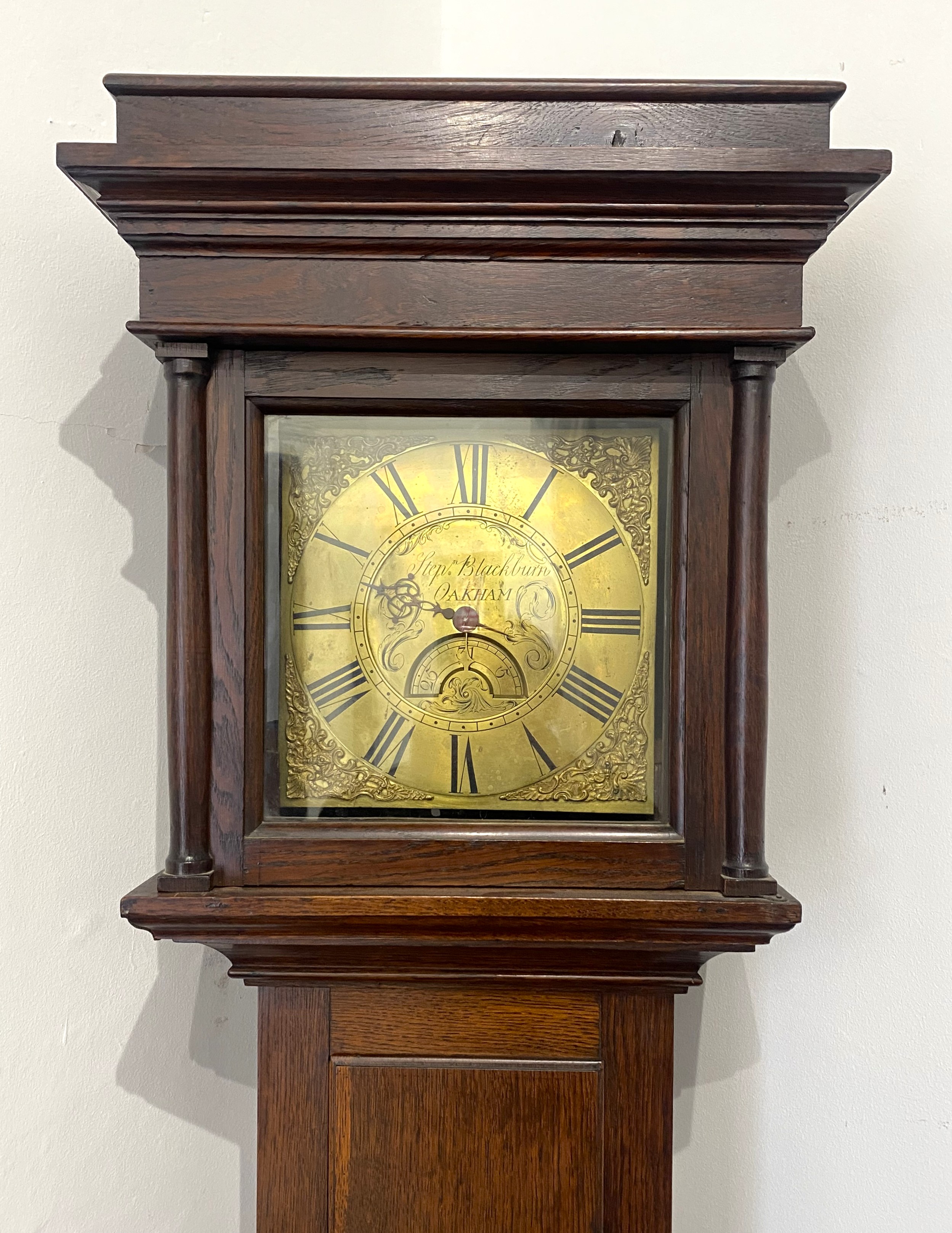 A Georgian oak cased striking 30 hour longcase clock, the 10 inch square dial inscribed 'Step'n Blackburn, Oakham', with date aperture, 198cm high (6'6"), with single weight and pendulum.