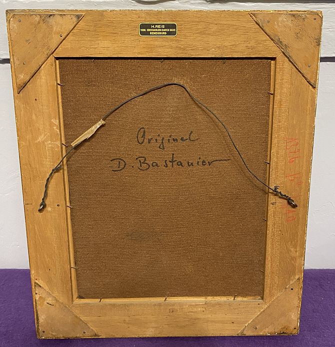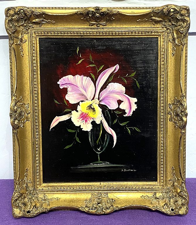 Dorothea Bastanier (German 1924-1970), still life of large orchid in a glass, oil on board, signed, verso inscribed, 28.5cm by 23cm