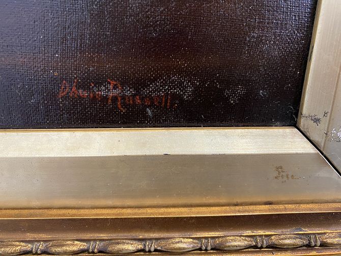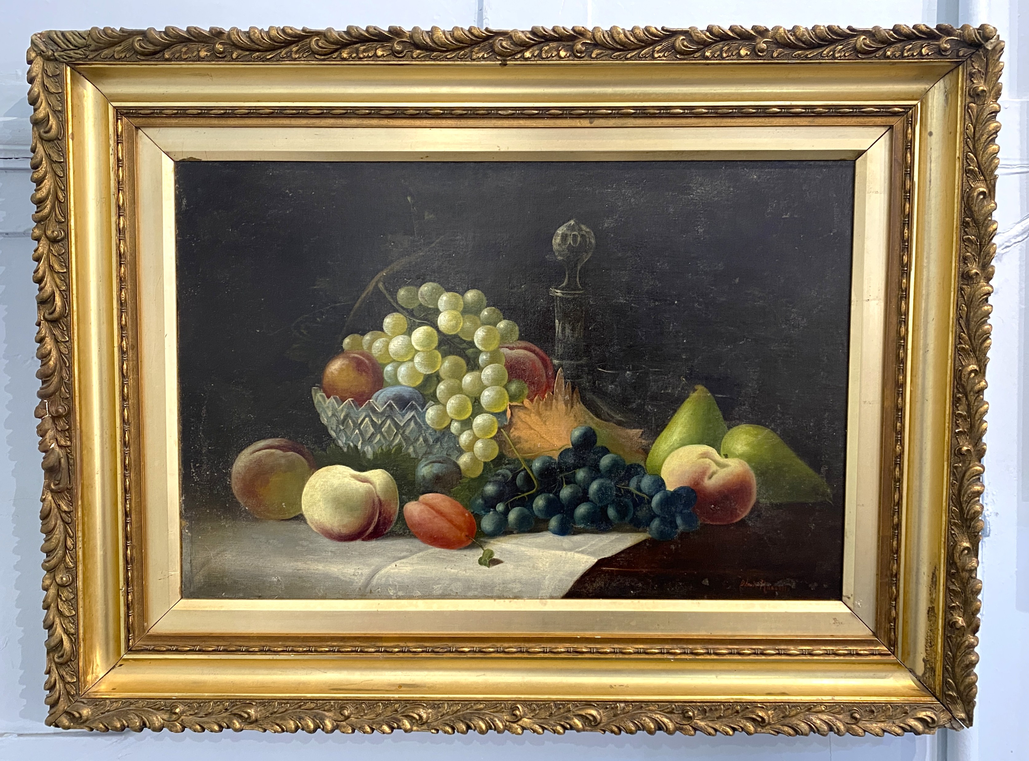 Dhuie Russell Tully (1862–1950), still life of fruit with decanter, wine glasses and crystal bowl, oil on canvas, signed, 39cm by 59cm
