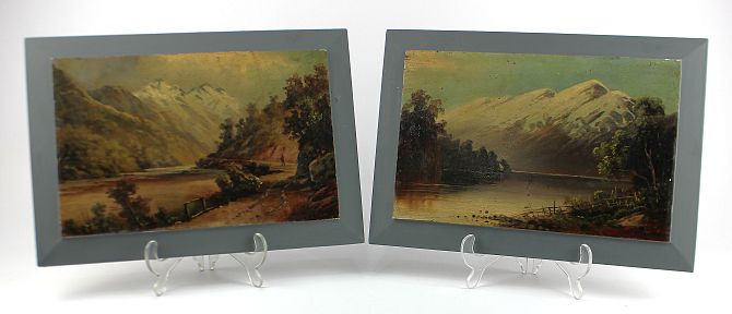 New Zealand School (19th century) 'The Otira Gorge' and 'Lake Ada, Milford Sound', a pair of landscape paintings, oil on board, unsigned, location inscribed in pencil verso, with painted surround, overall 25cm x 35cm (2)