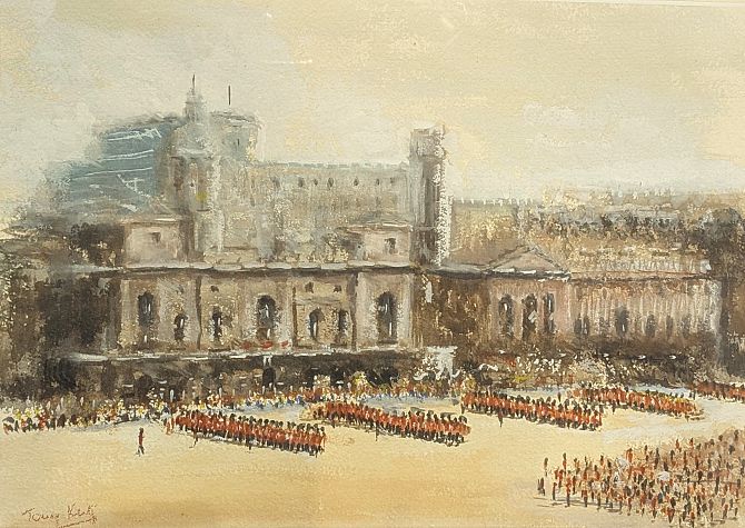 20th century school, Royal Guards Parade, watercolour and gouache, indistinctly signed Tony *?, 36cm by 51cm