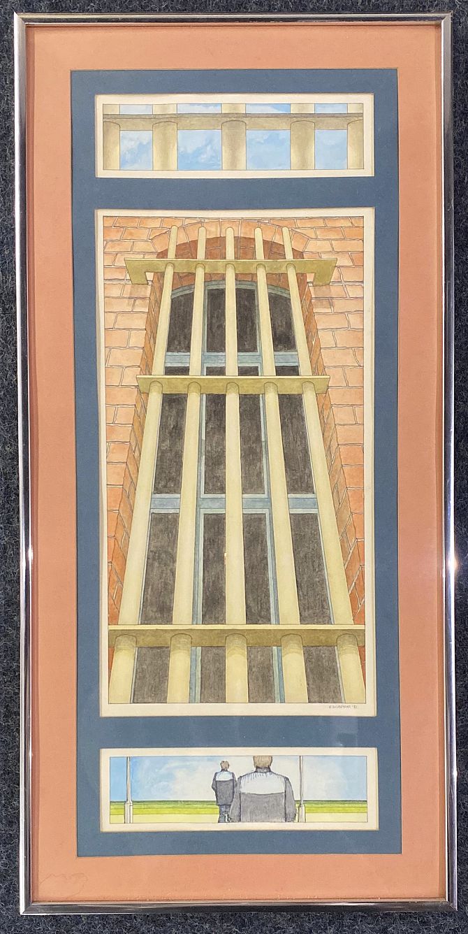 20th century school, prison views, 'Escapism', watercolour and ink, inscribed and dated 81, 56cm by 21.5cm