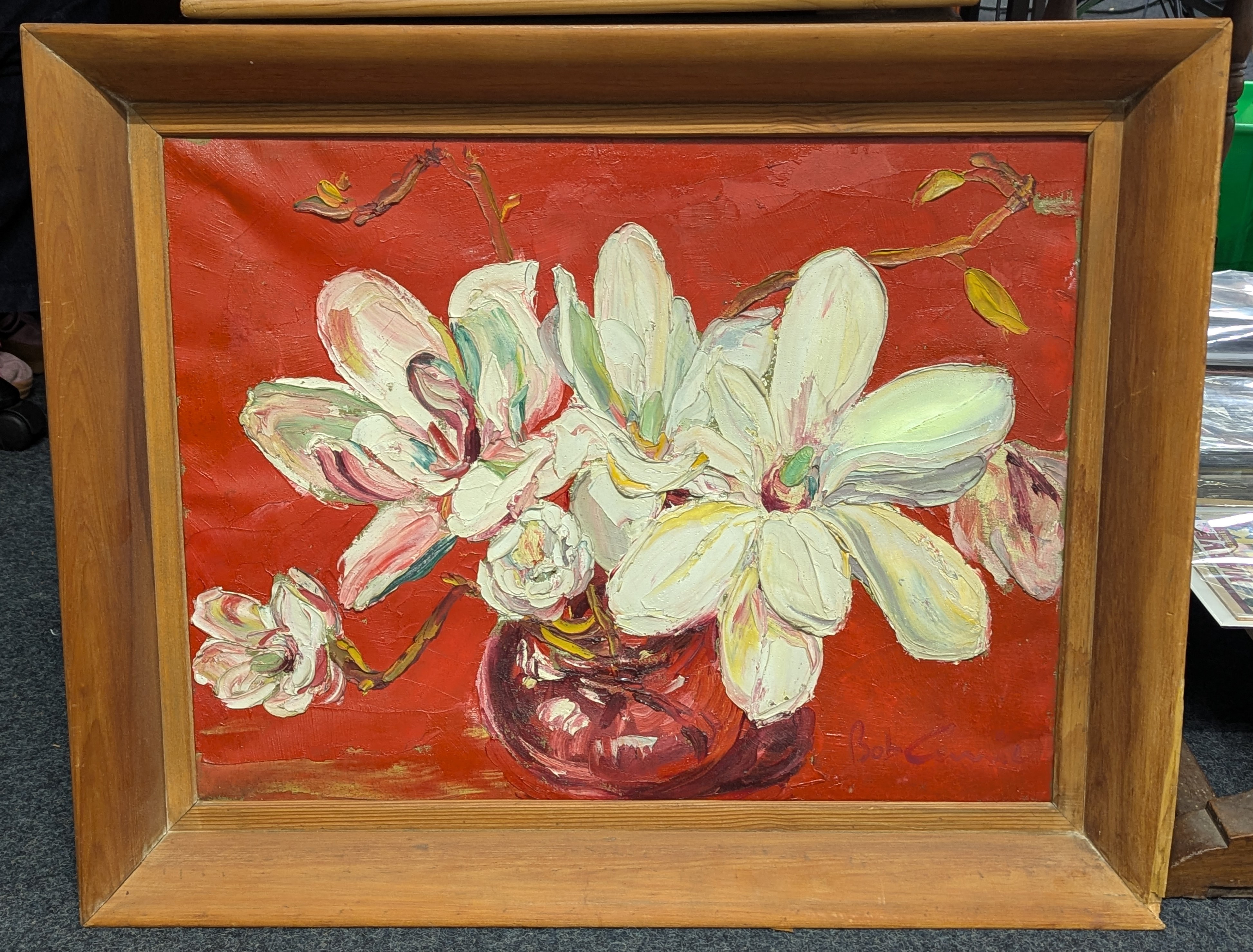 Bob Canil (20th century), still life of magnolias, oil on canvas, signed, 49cm by 65cm (a/f)