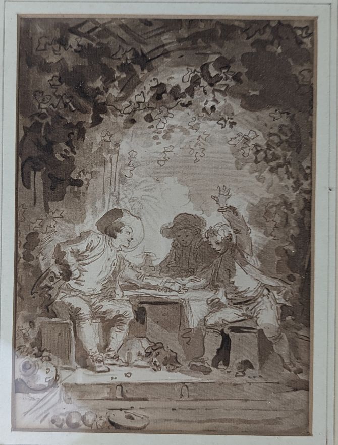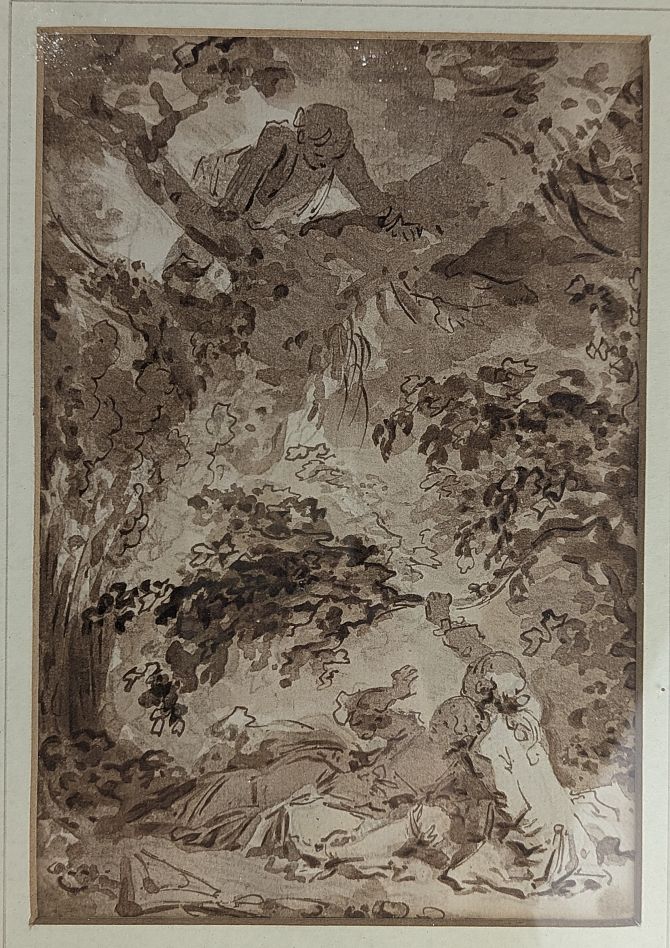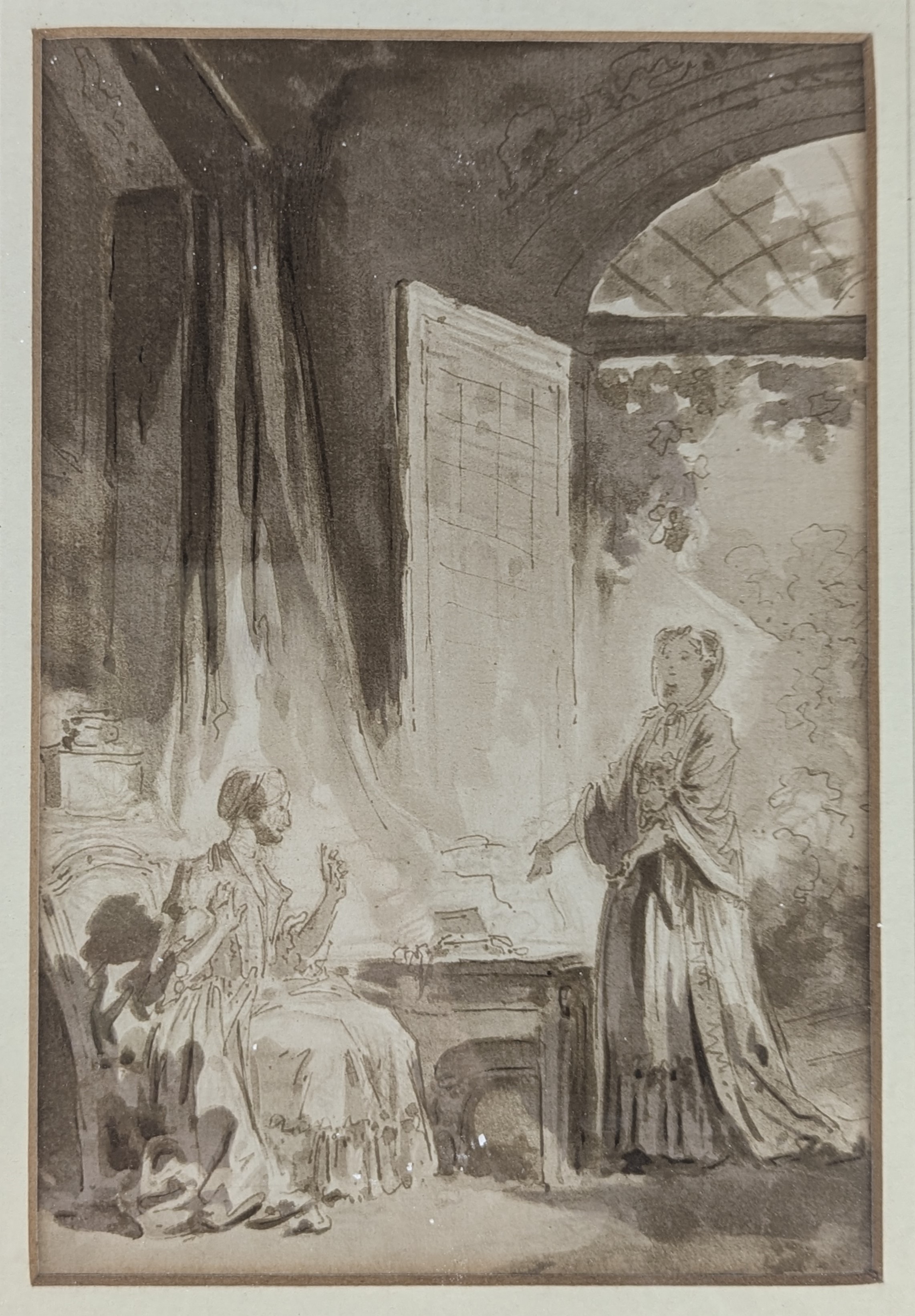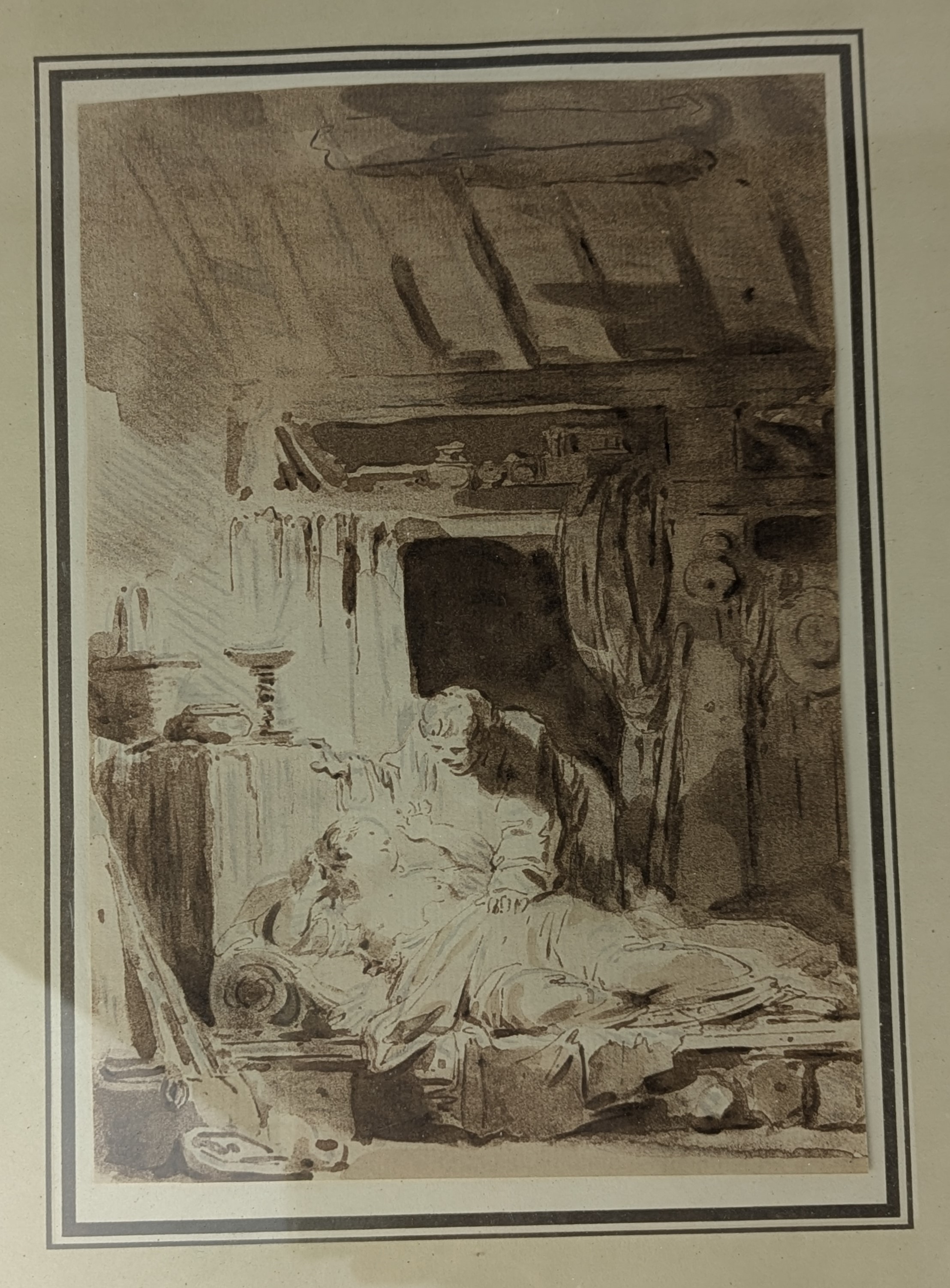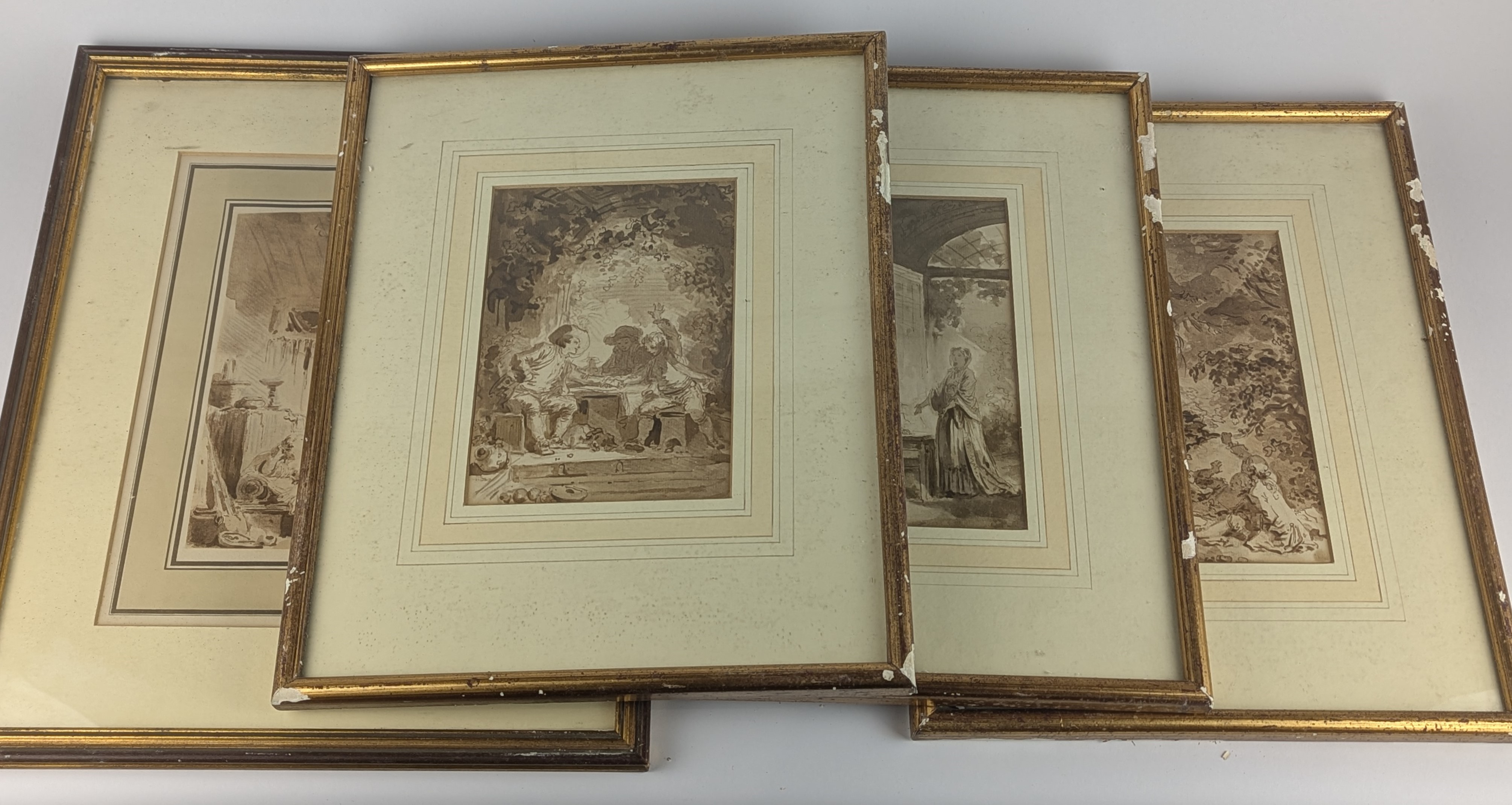 After Jean-Honoré Fragonard (French 1732-1806), four framed sepia washes to include 'La Confidente sans le Savior ou le Stratageme' and 'Les Troqueurs', 20cm by 13cm