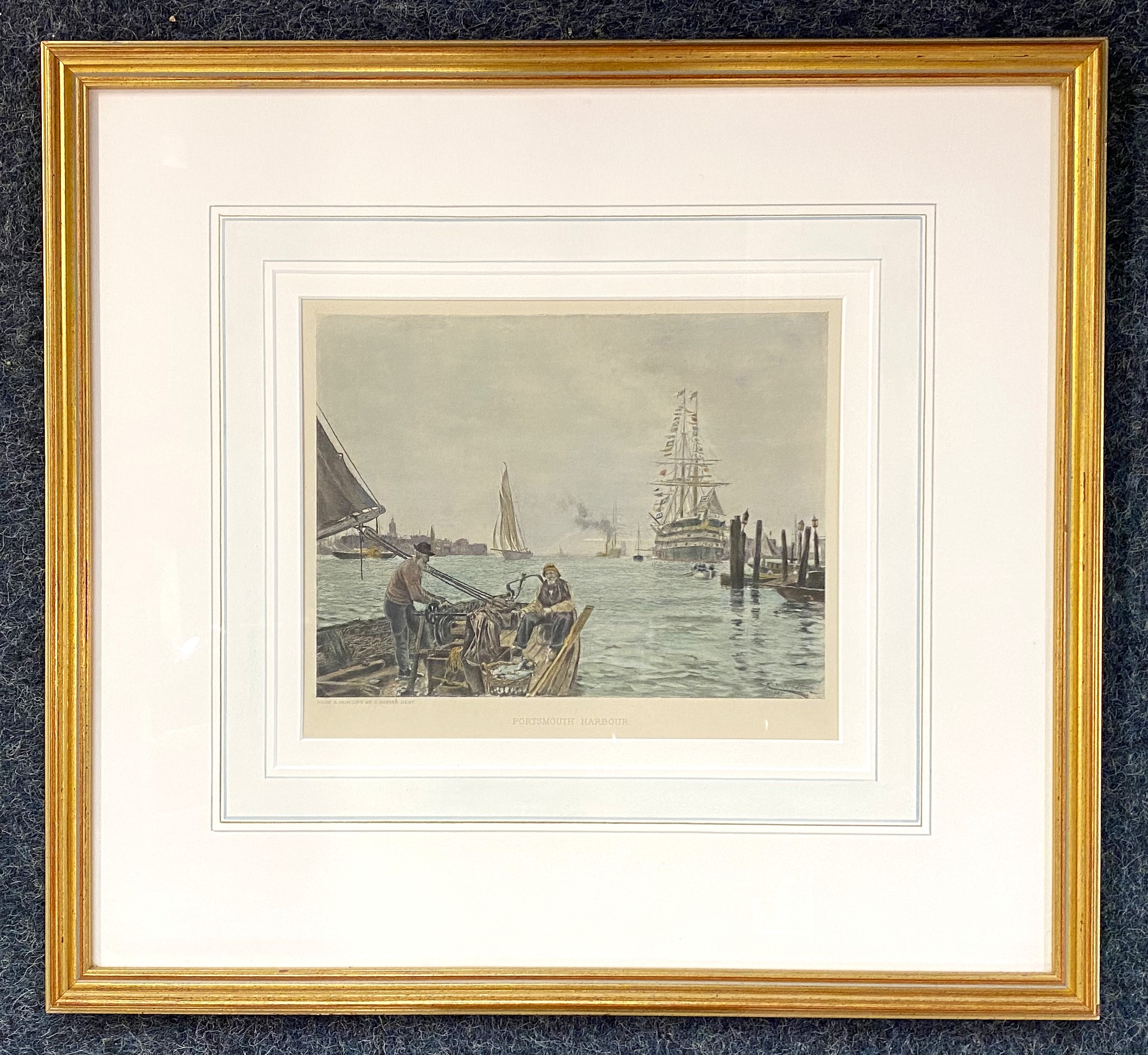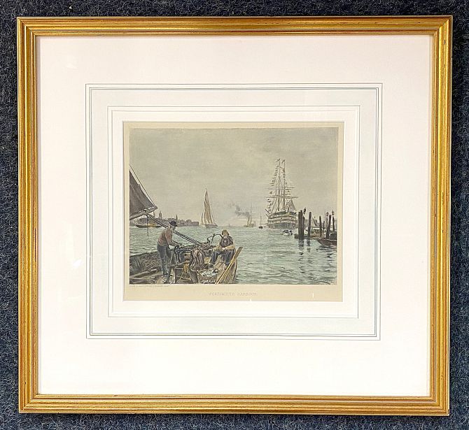 After Charles Napier Hemy (1841-1917), Portsmouth Harbour, coloured engraving, 21cm by 25.5cm
