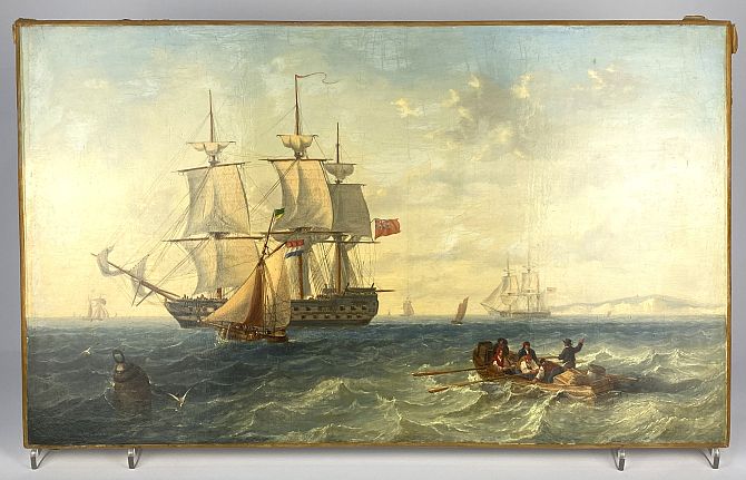 John Wilson Carmichael (British, 1800 - 1868), 'A BRITISH TWO-DECKER HOVE-TO WHILE DROPPING HER PILOT', oil on canvas, signed lower left, artists name and title plaque verso, 39cm by 62cm, cleaned and re-lined, framed (displayed within a 19th century swept gilt gesso frame, also with a second gilt frame, and parts of the original frame).