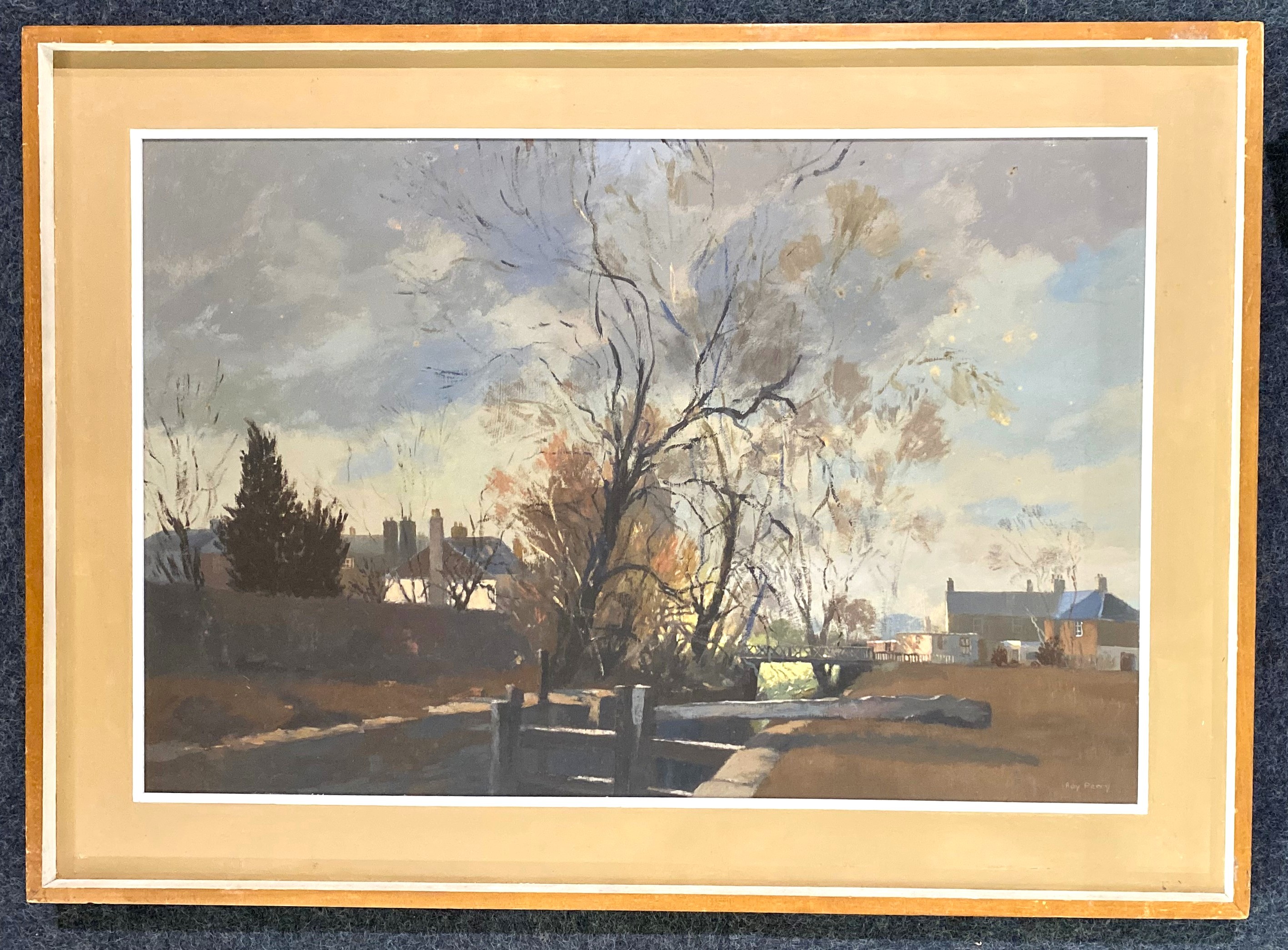 Roy Perry (1935-1993), Autumnal landscape view of canal lock with trees, oil on board, signed, 49cm by 74cm (ARR)
