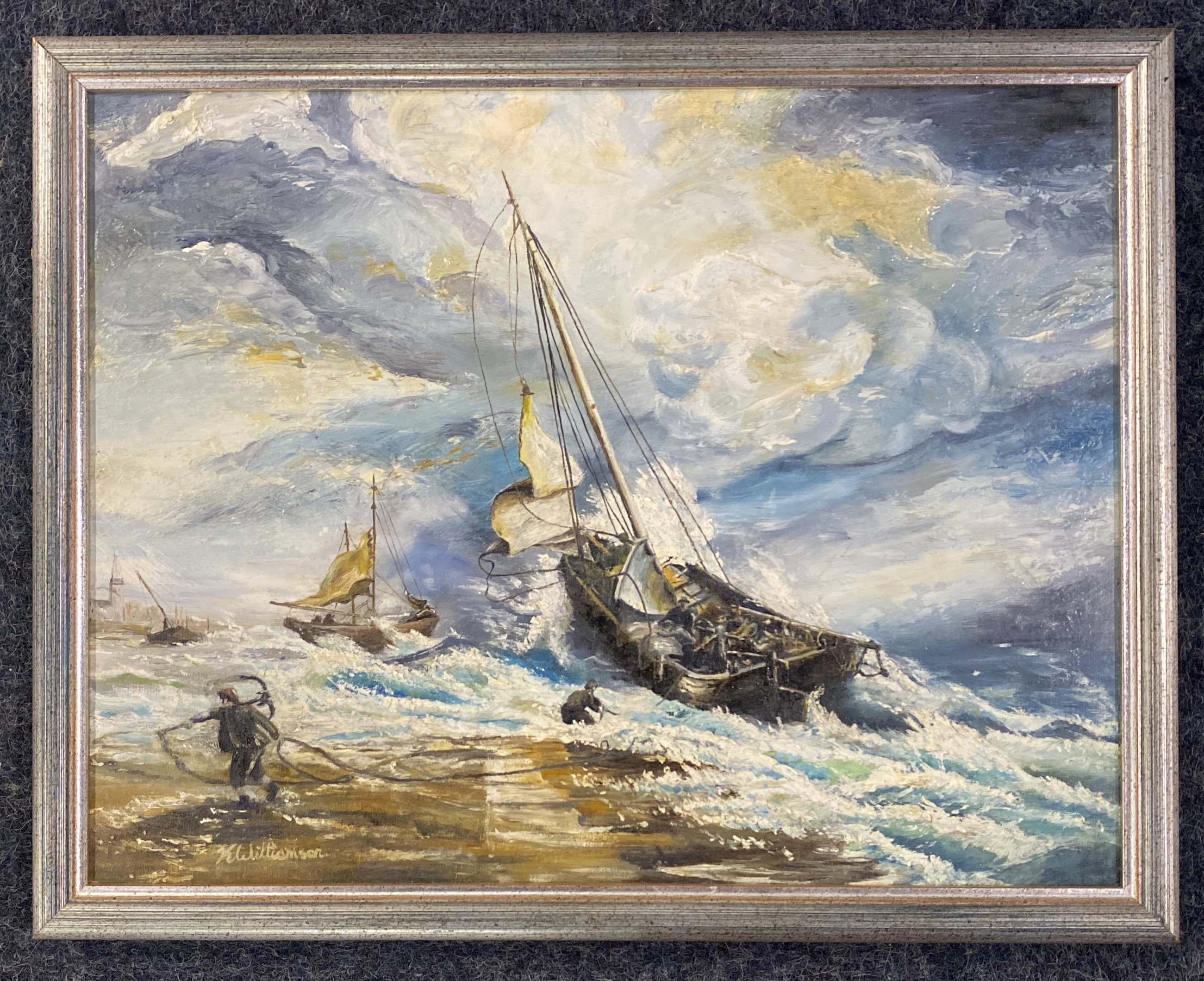 K Williamson (20th century), ships in a storm, oil on board, signed, 34cm by 44cm