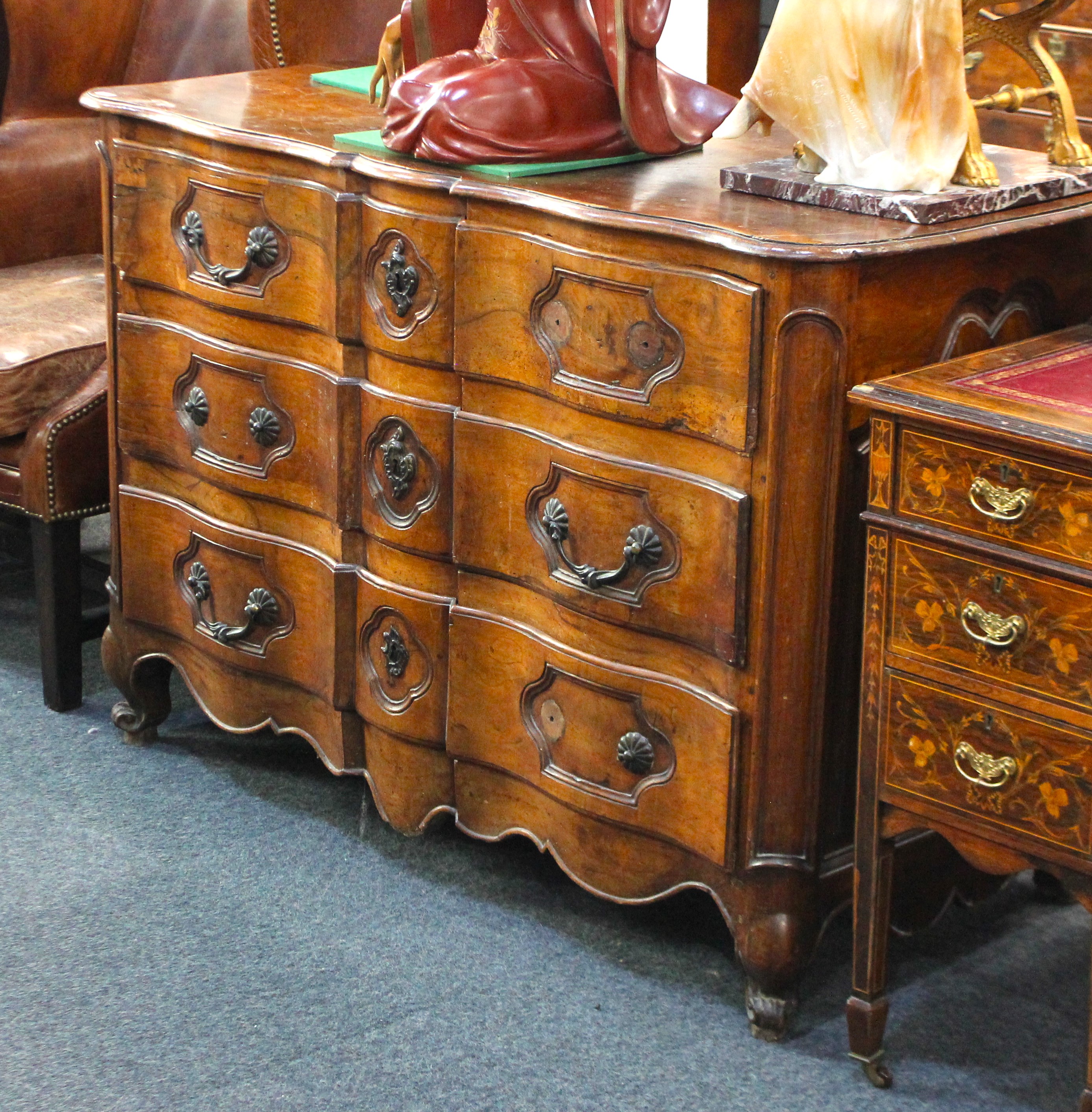 A 18th century French provincial fruitwood shaped front chest of drawers, having three long drawers decorated with shaped panels above the shaped apron and scrolled ogee front feet, with shaped fielded panels to either end, 129cm wide by 61cm deep by 88cm high, (two handles lacking).