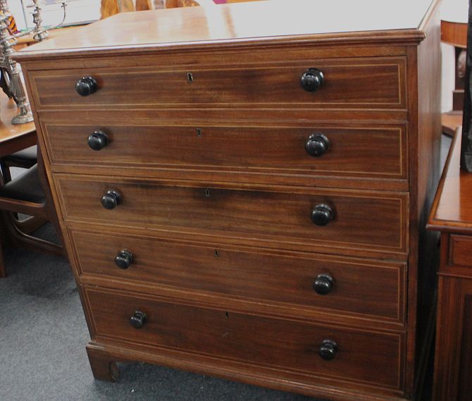 A 19th century mahogany secretaire chest inlaid with boxwood stringing, the two dummy upper drawers hinged to reveal a crisp marquetry inlaid fitted interior, above three long graduated drawers, raised on bracket feet, 110cm wide by 60cm deep by 116cm high.
