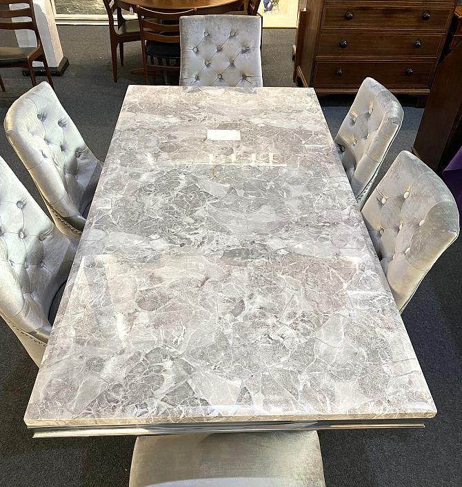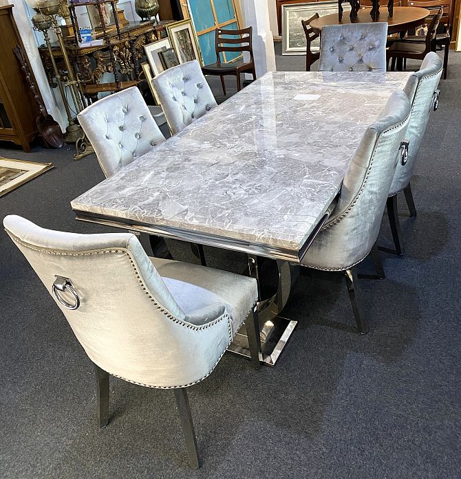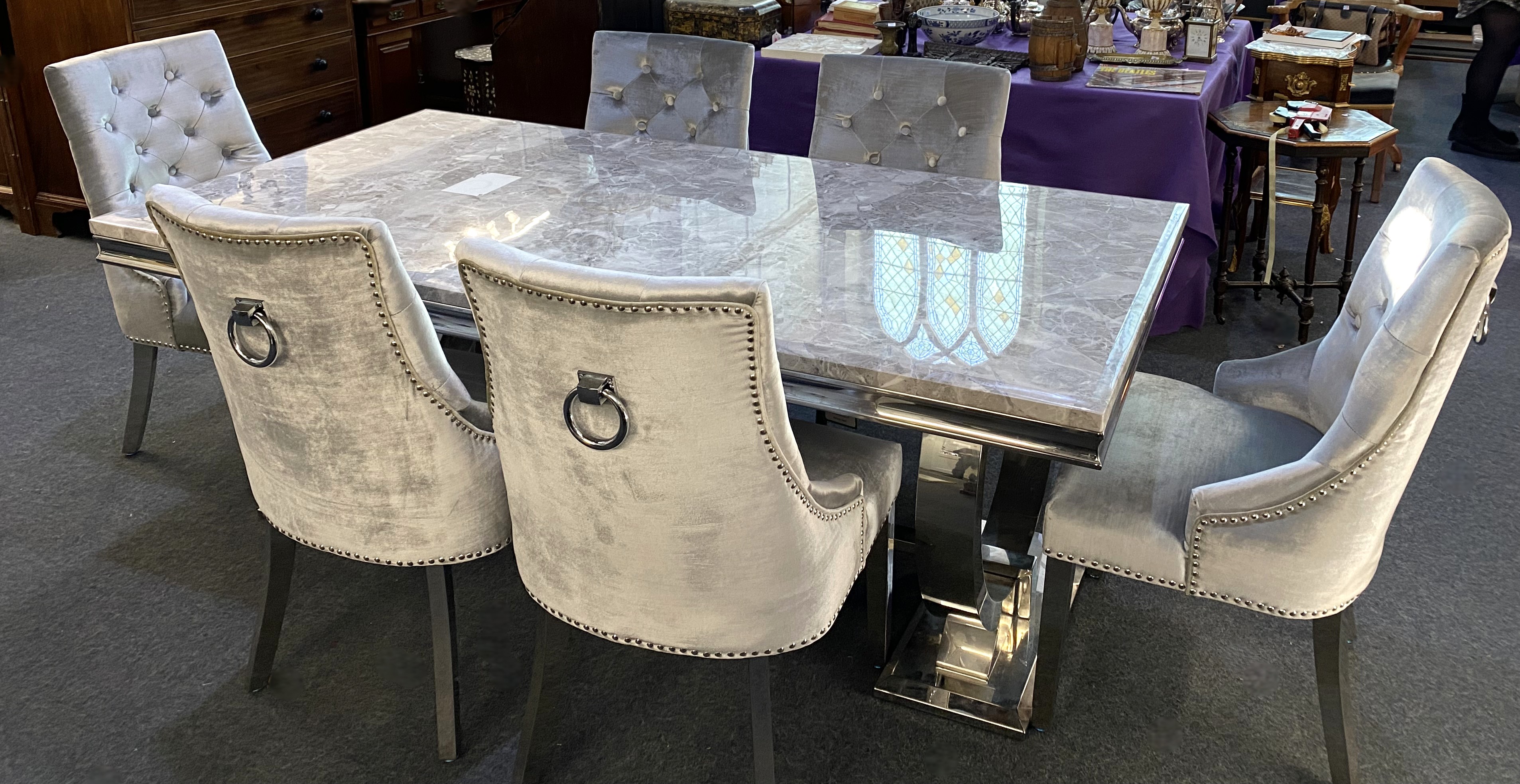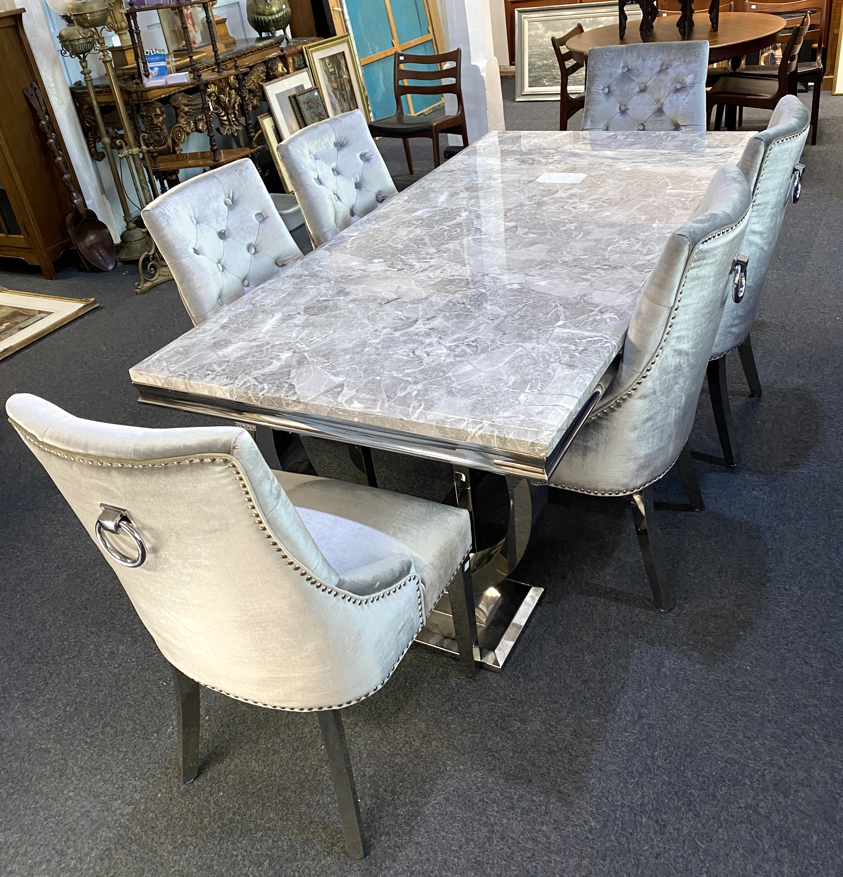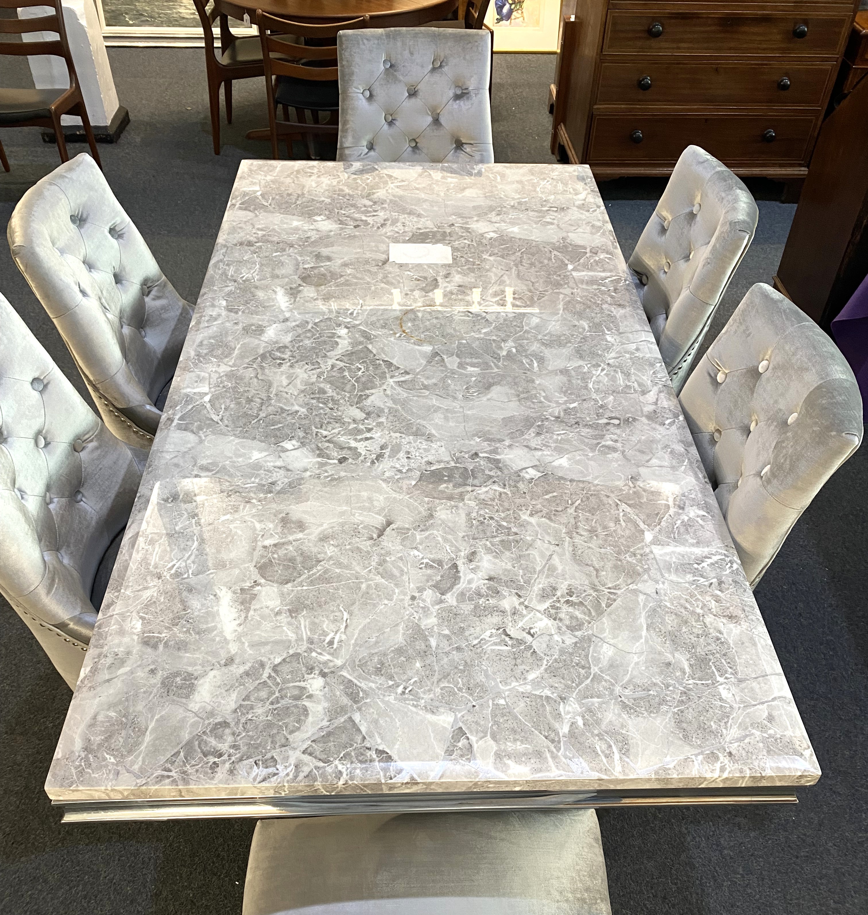 A contemporary dining suite, comprising a rectangular table with veined grey marble effect top raised on and Art Deco style silvered metal base, 200cm by 100cm, together with six buttoned silvered grey fabric upholstered chairs raised on silvered metal legs.