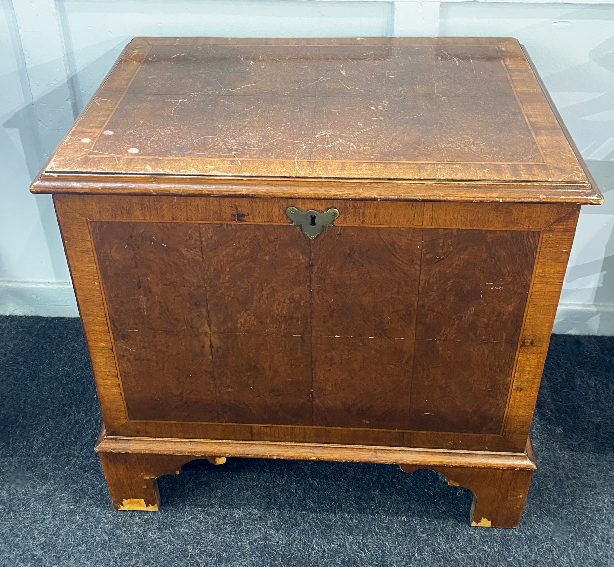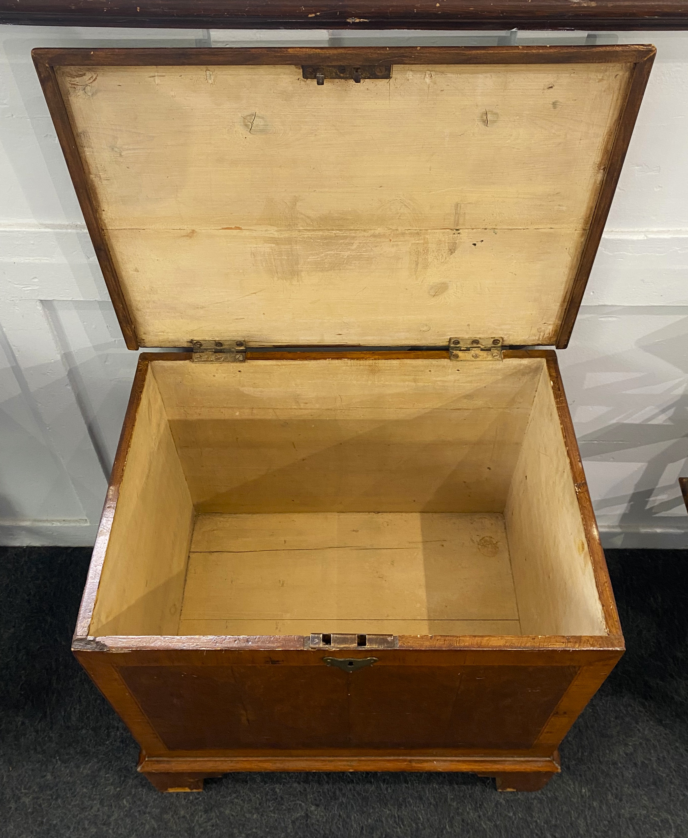 A Victorian figured walnut and walnut veneered box / trunk, with hinged lid, painted interior, and bracket feet, 64cm wide by 46cm deep by 62cm high, (af).