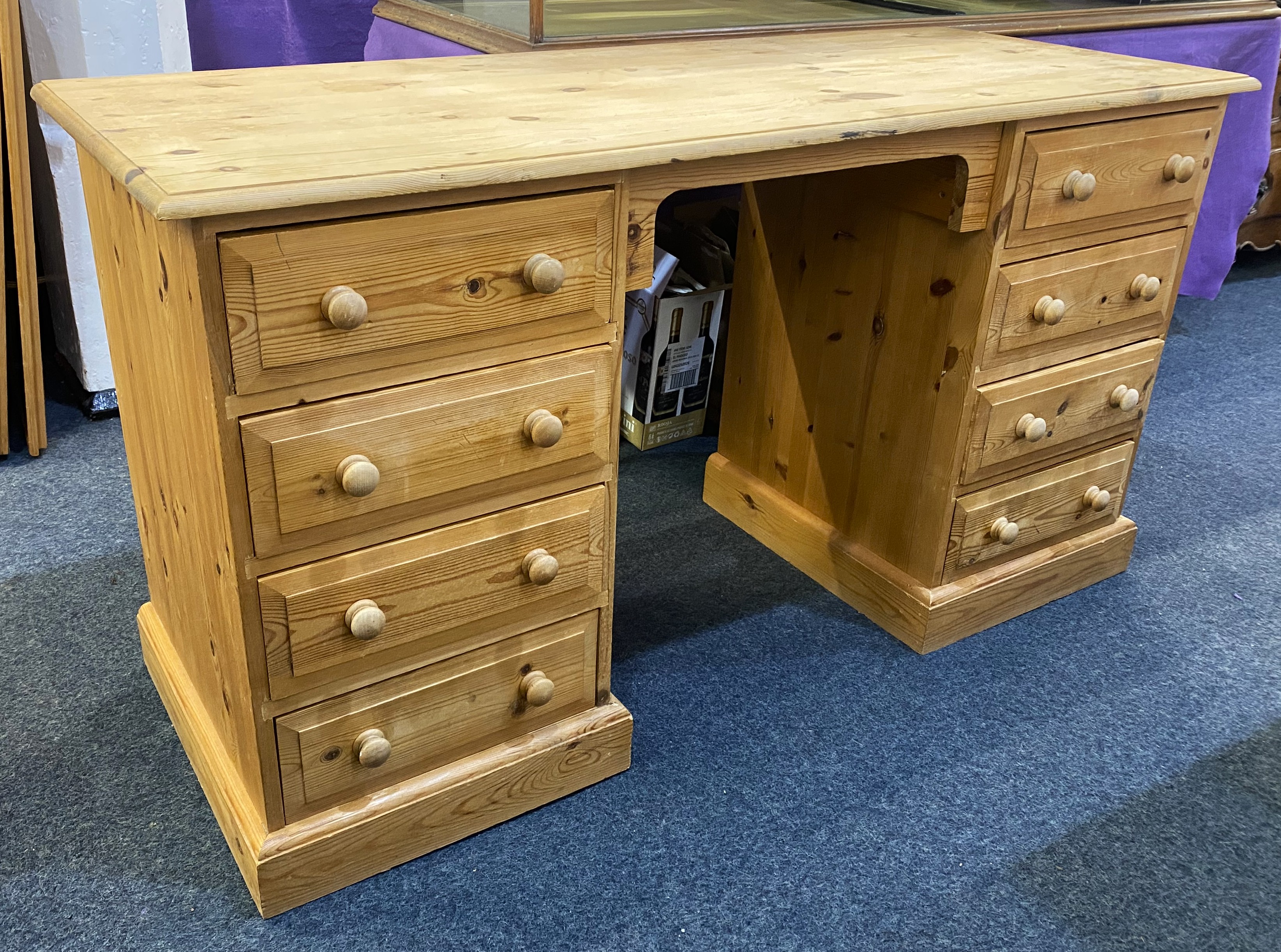A pine desk, 20th century, the rectangular top with moulded edges above centra; kneehole flanked by eight drawers with turned knob handles, raised ona plinth base, 145cm wide by 58cm deep by 78cm high.