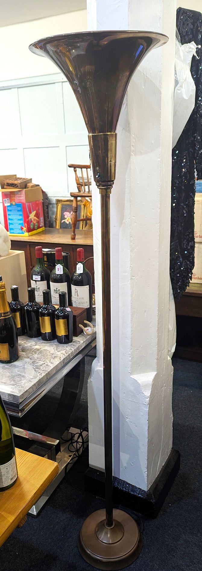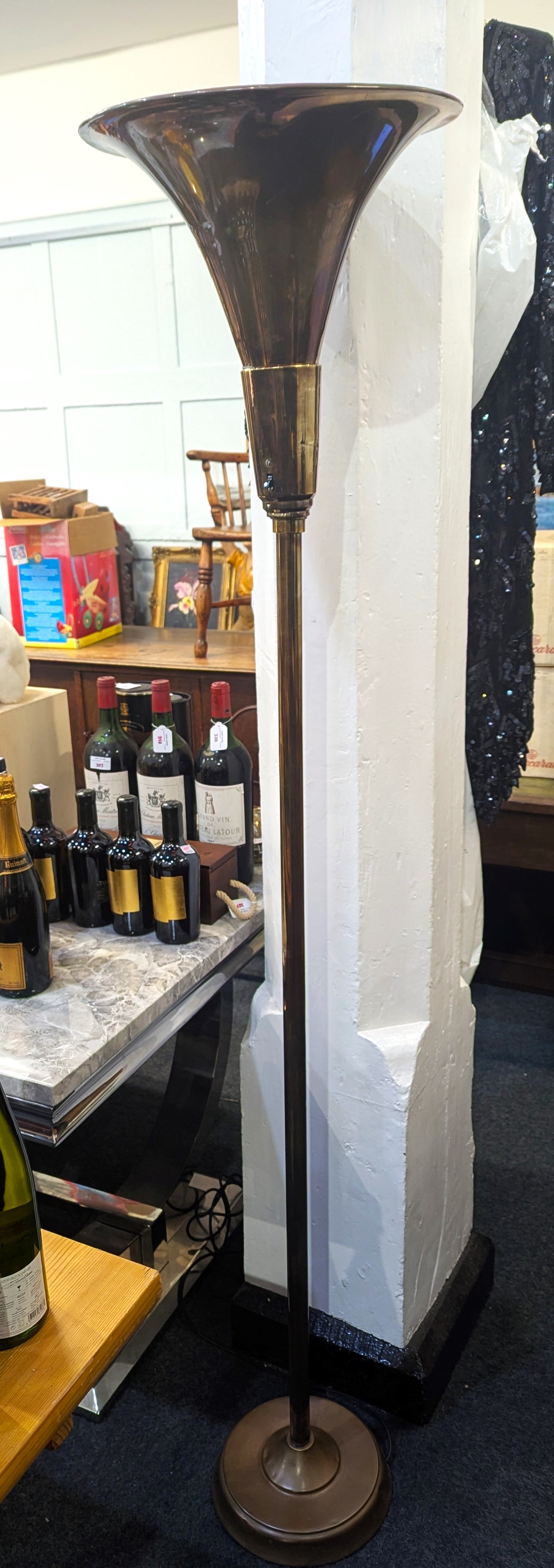 An Art Deco brass uplighter standard floor lamp, probably German or Italian in design, with inverted pyramidal shade, 178cm high