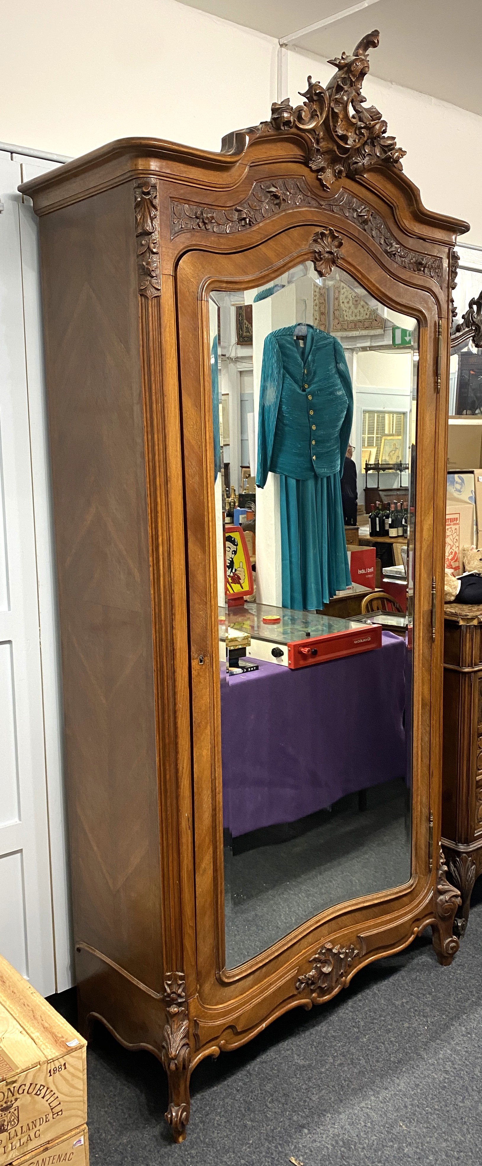 A good quality vintage French cross banded and carved oak armoire, with bevelled mirrored door, and front scrolled supports, 108cm by 246cm high.
