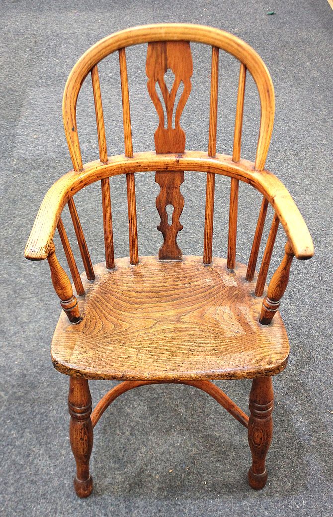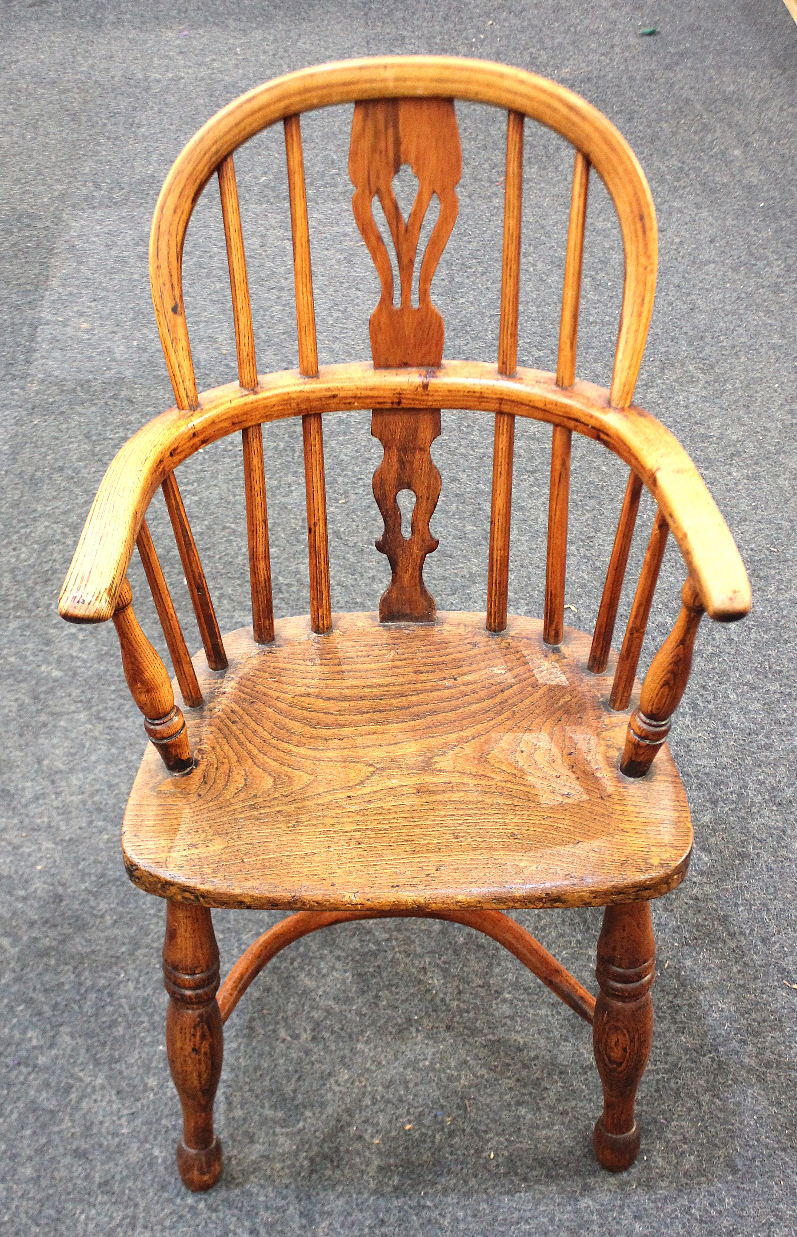 A 19th century child's elm and yew child's windsor chair with crinoline stretcher 74.5cm high
