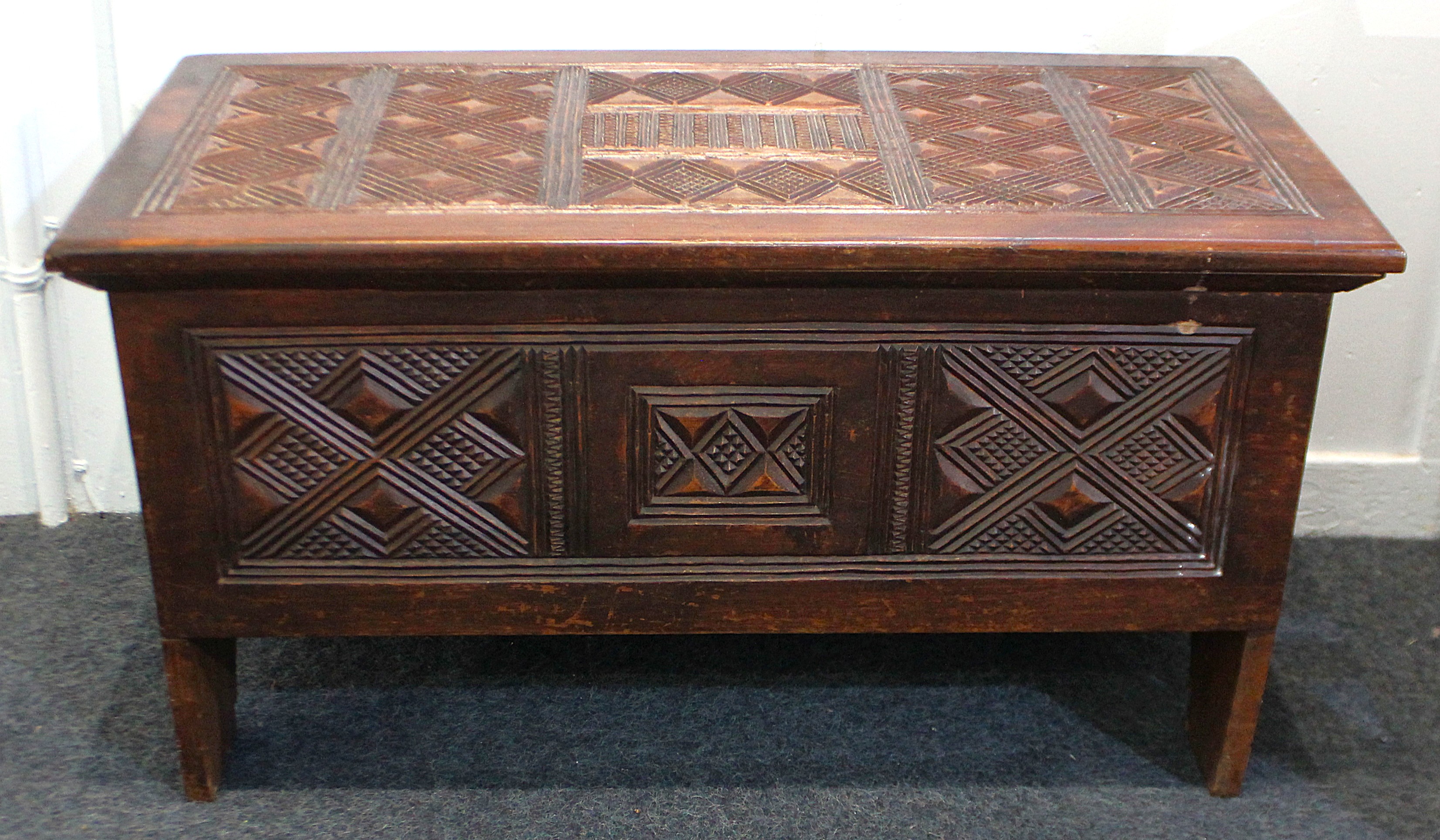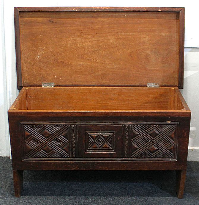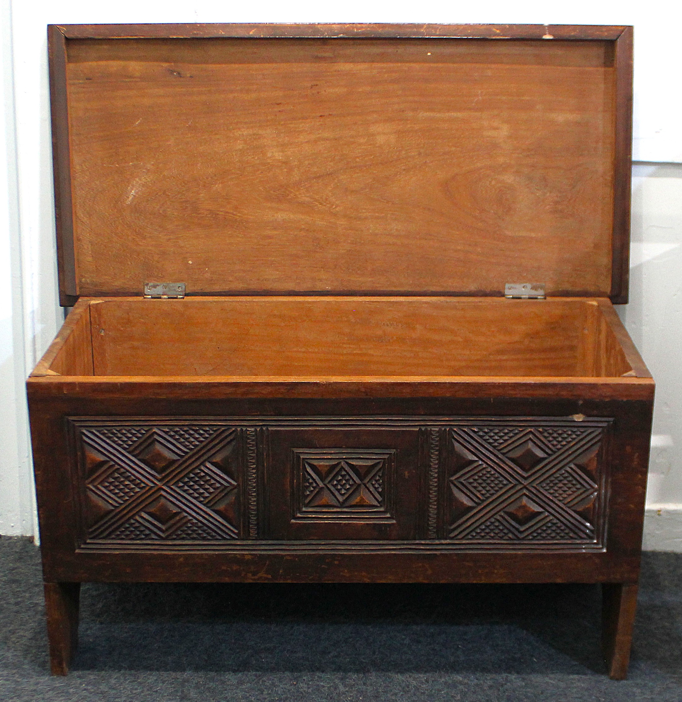 A c.1950's Nigerian carved wooden storeage chest / blanket box, with carved decoration and shaped end supports, 91cm wide by 44cm deep by 48cm high.