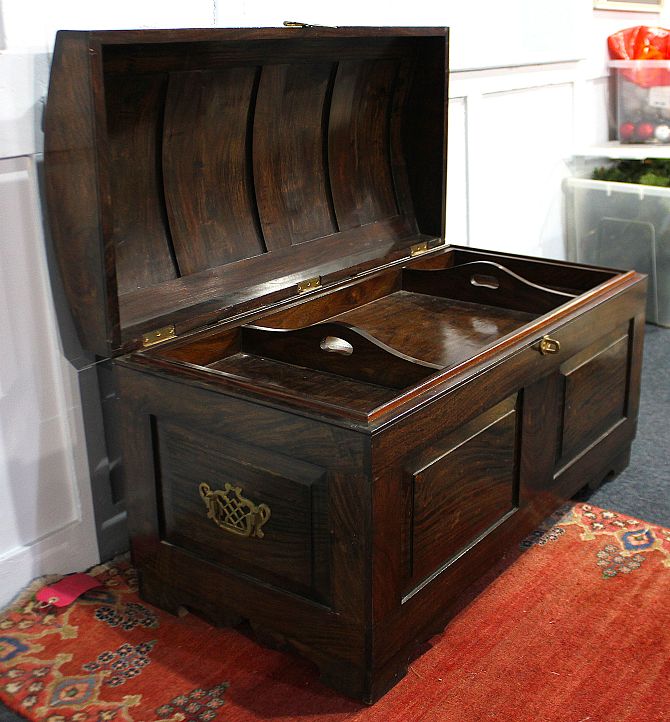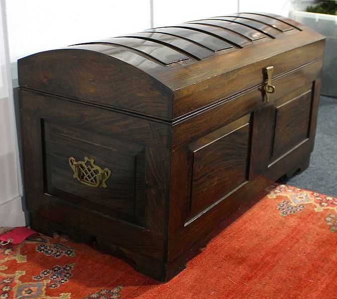 An Eastern panelled harwood trunk, 20th century, with a hinged domed lid enclosing a tray interior, flanked by brass carrying handles, 92cm wide by 46cm deep by 93cm high.