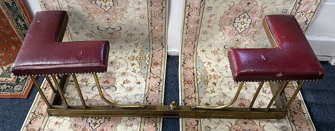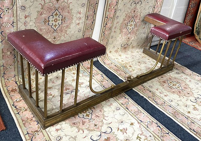 A vintage brass club fender with red leatherette corner seats, 146cm wide.