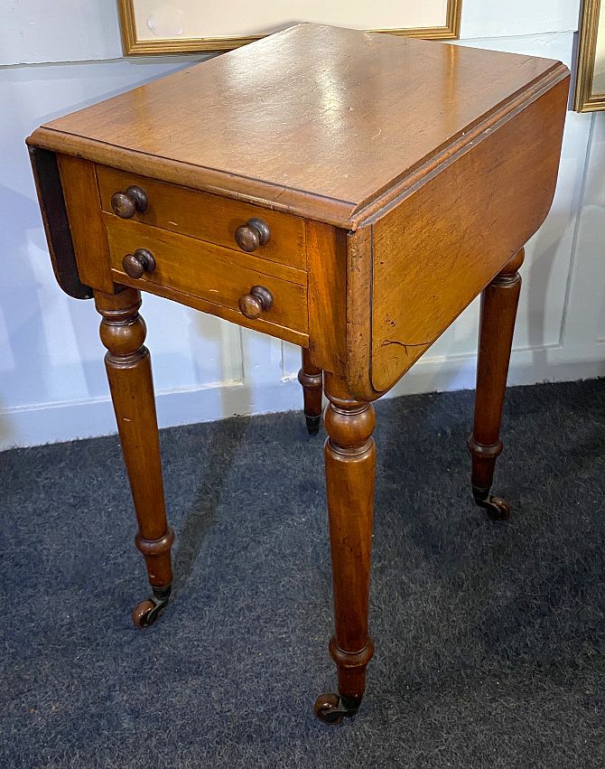 A Victorian mahogany drop leaf work table, having moulded edges and rounded corners, fitted with two working drawers and two dummy drawers, raised on tapered supports terminating on casters, 51cm by 37cm opening to 76cm by 51cm.