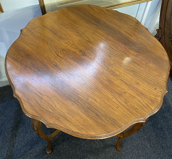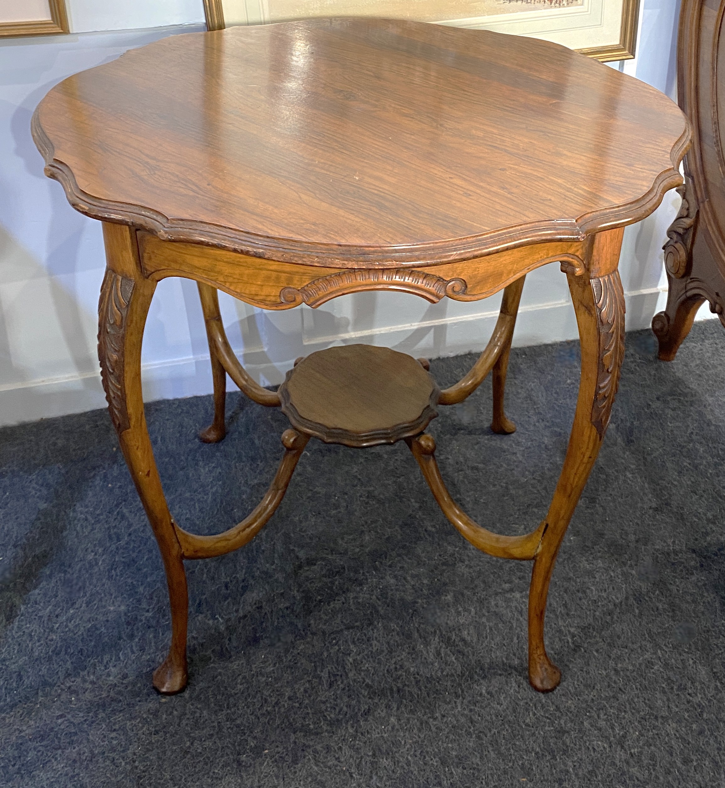 An Edwardian walnut centre table / side table, with shaped circular top and braced undertier, raised on accanthus carved ogee supports, 76cm diameter.