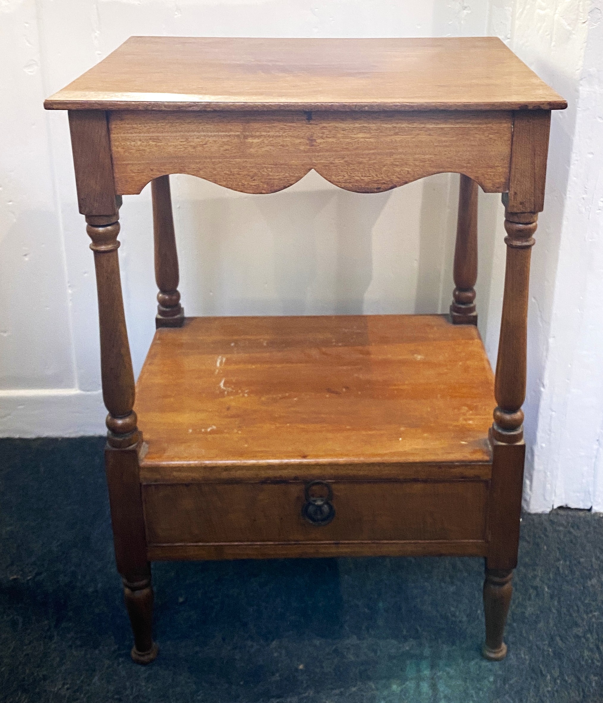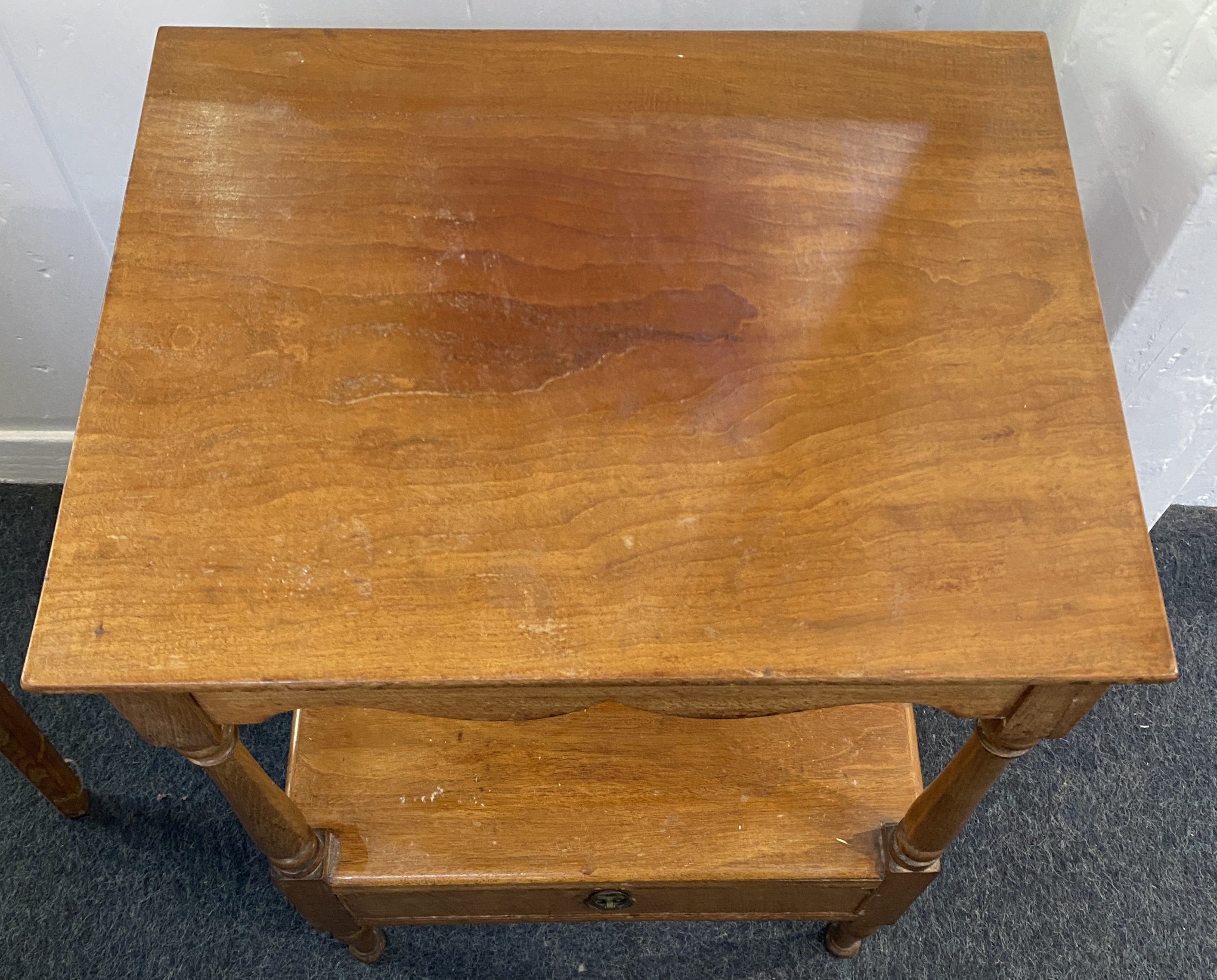 A rustic fruitwood two tier side table, c.1900, fitted with a drawer, 50cm wide by 39cm deep by 71cm high.