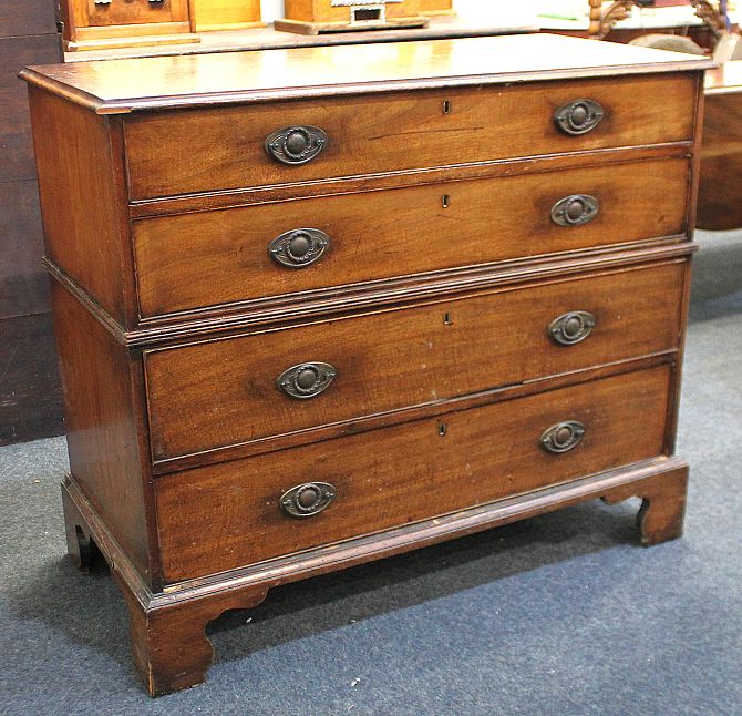 A George III mahogany chest of drawers, in two sections, fitted with four oak lined long drawers, raised on shaped bracket feet, 110cm wide by 51cm deep by 94cm high, (af).