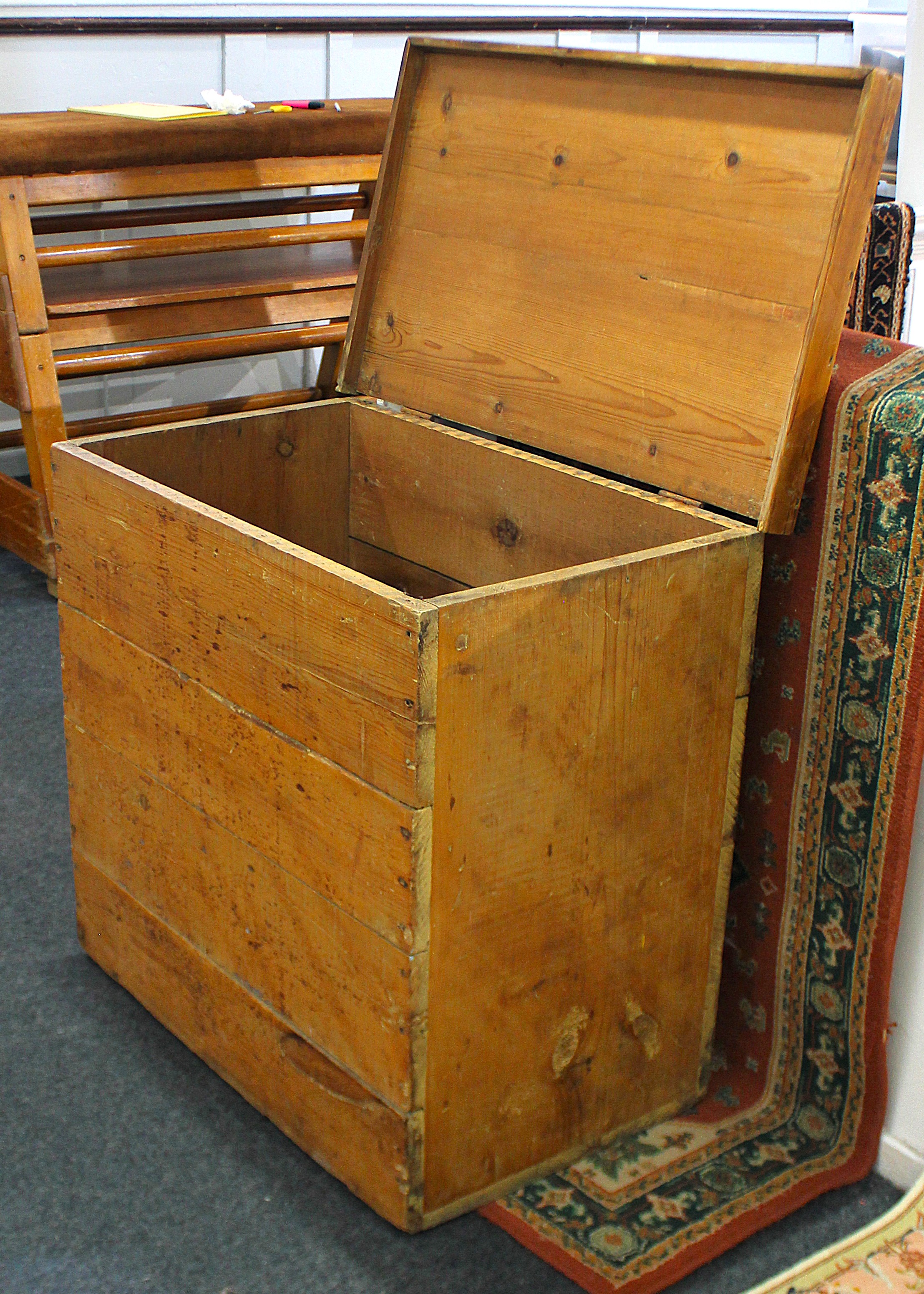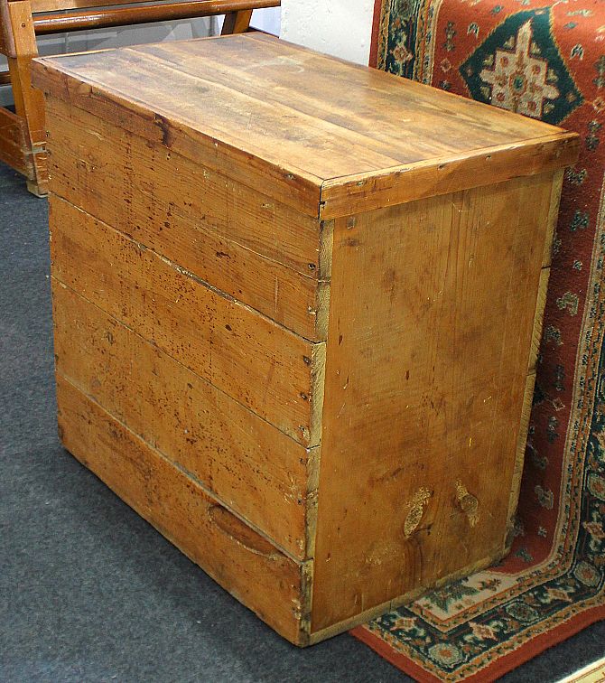 An old stripped pine box / trunk, with hinged lid, 78cm wide by 47cm deep by 73cm high.