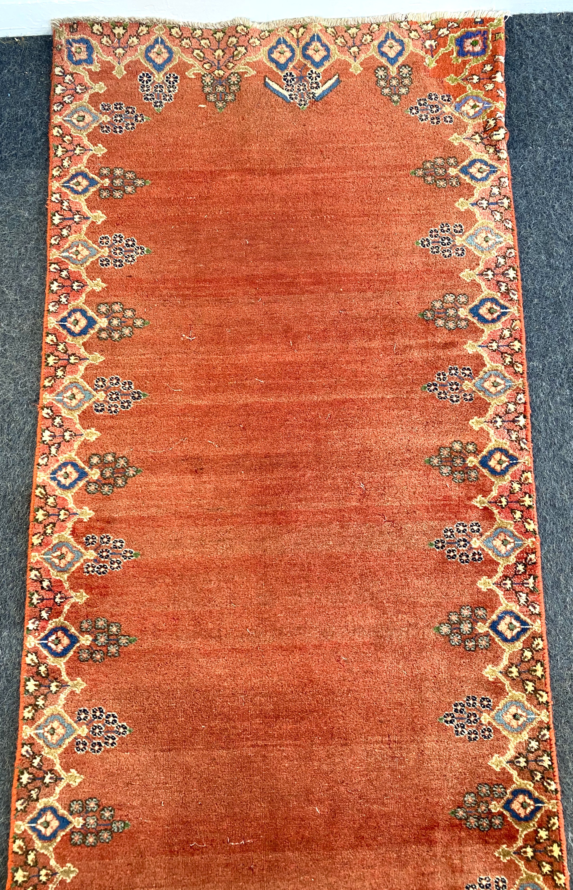 A Gabbeh style runner, teracotta ground within stylised border, approx 445cm by 98cm