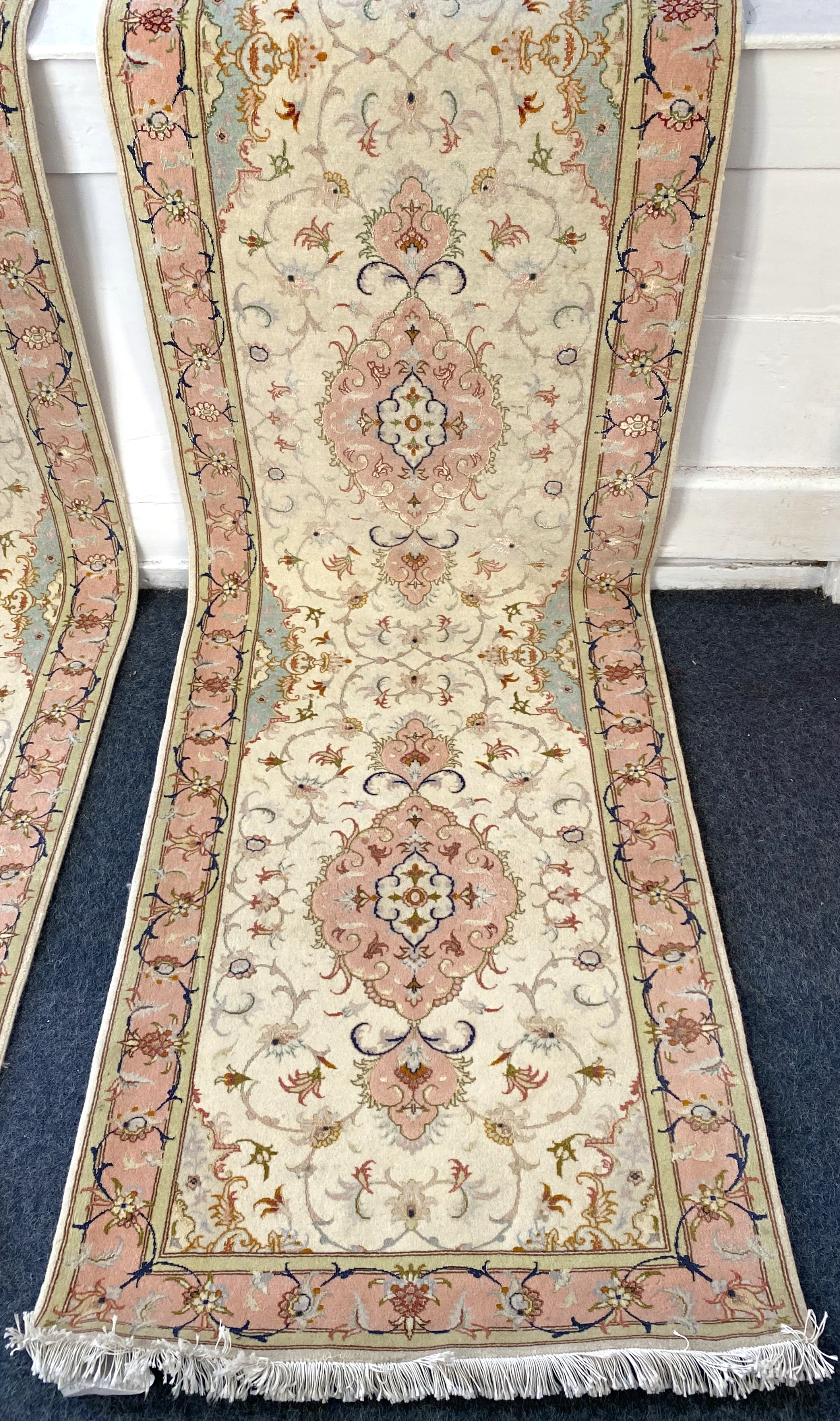 Lot 653: A good quality Persian Tabriz runner , decorated with traditional medallions and scrolling motifs within borders, muted tones, approx 325cm by 78cm.