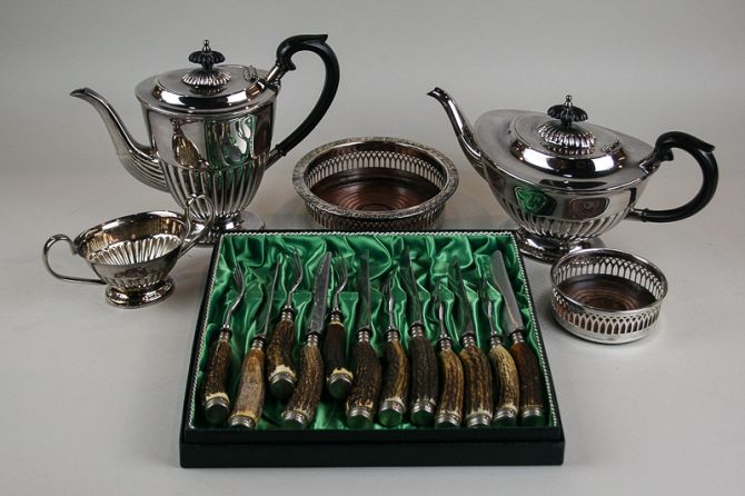 A plated oval tea pot and hot water jug; a muffin dish with liner; another smaller; a rectangular drinks tray and other plated items