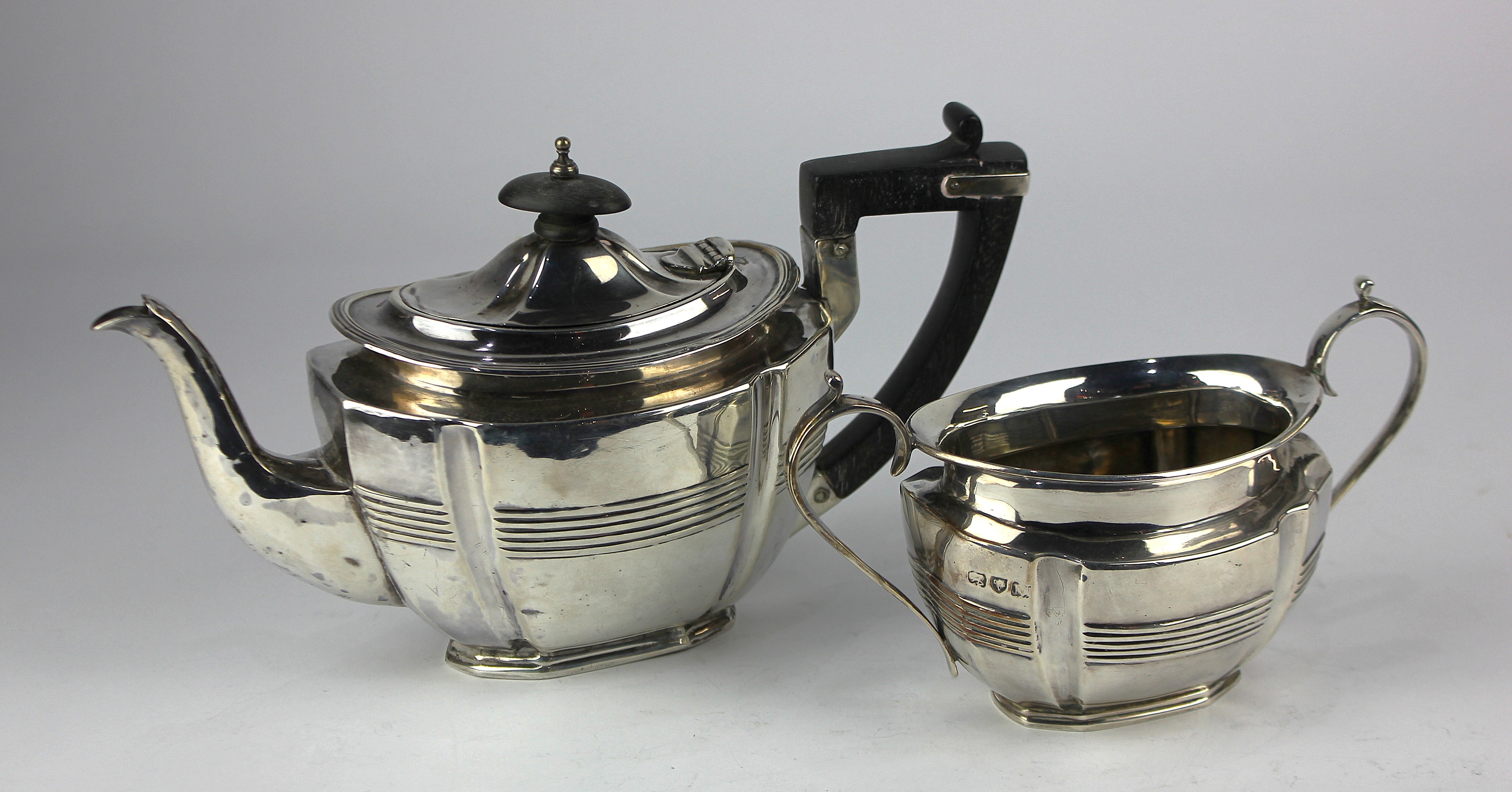 A late Victorian silver teapot and sugar basin, maker George Nathan & Ridley Hayes, Chester 1896, with reeded band, ebonised handle to teapot, 14.5cm high, combined gross weight 15.8oz