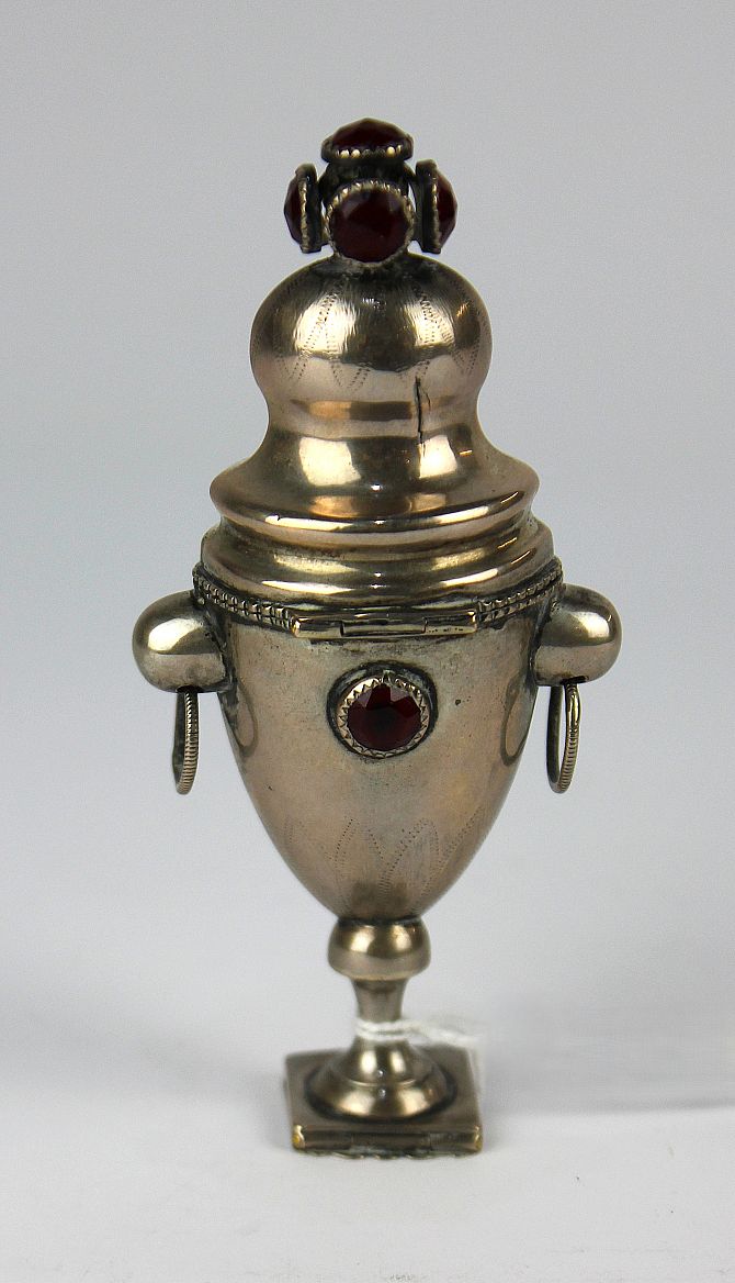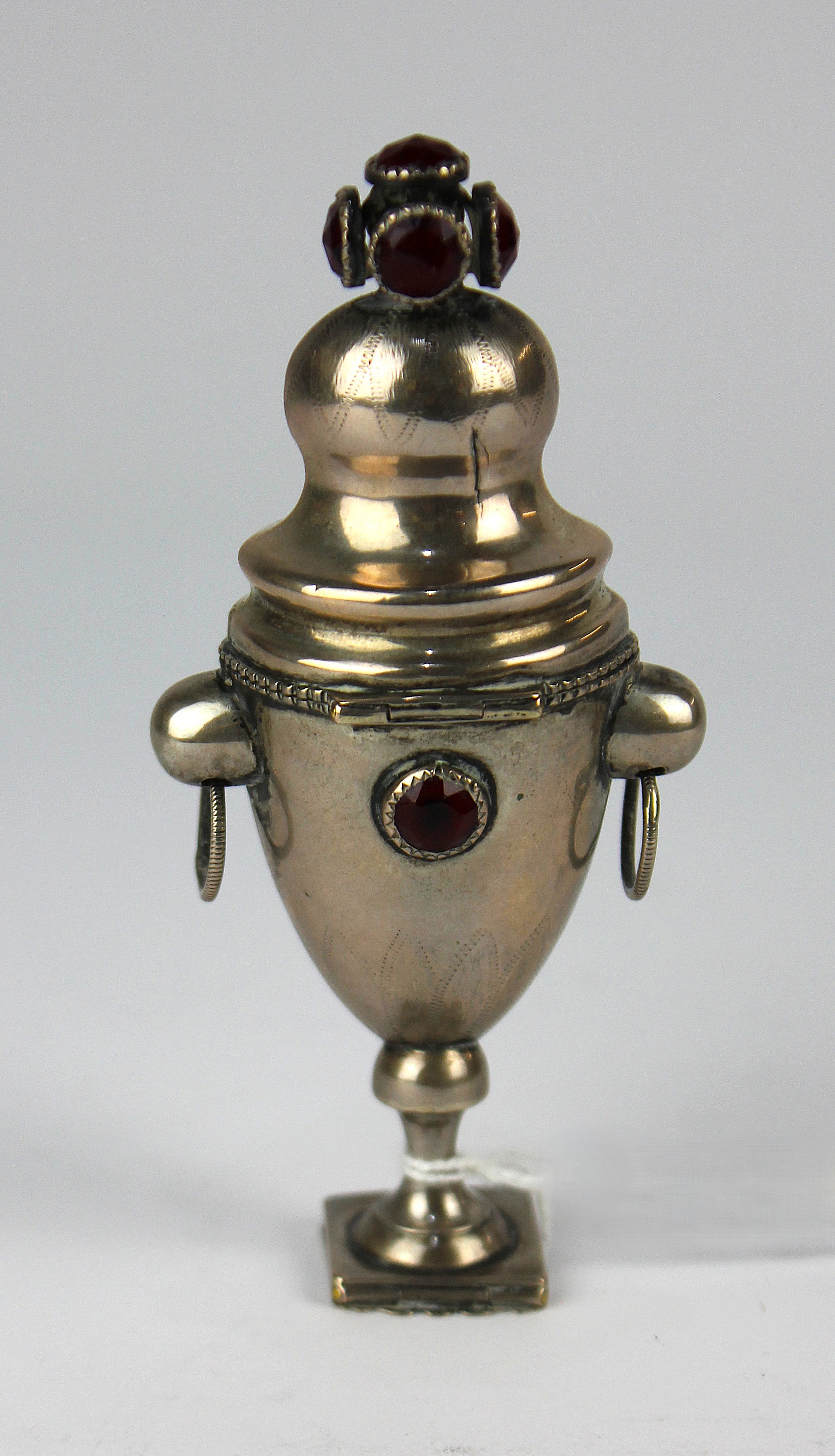 A Scandinavian white metal hovedvandsaeg or marriage box, combined pomander/ vinigrette bottle, possibly Danish, 19th century, inset with red stones, with a pair of carrying handles, the base with hinged lid, bearing worn mark, decorated with leaf motif, height 11.5cm
