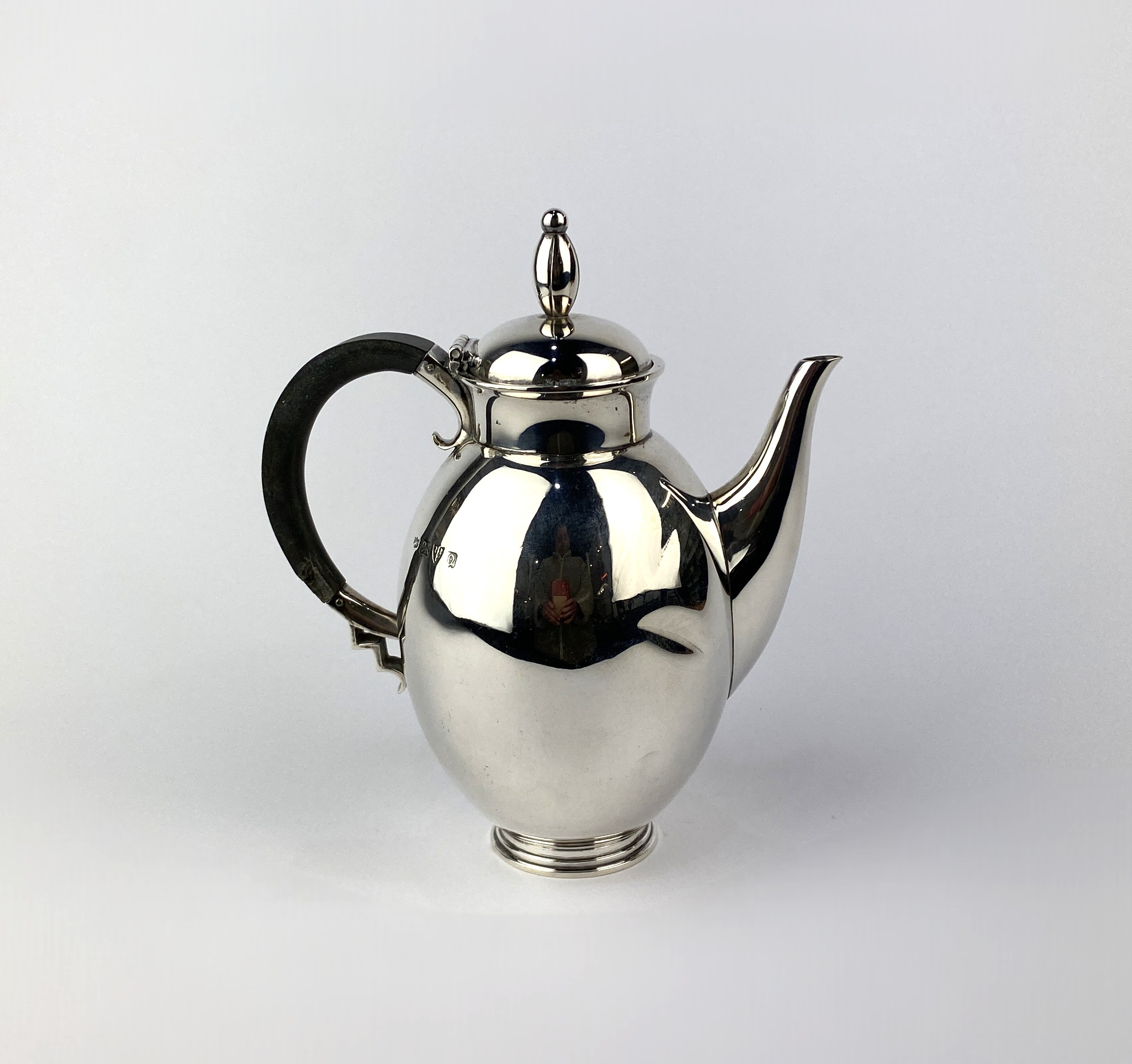 A George VI silver coffee pot, maker S. B. & S. Ltd, Chester, 1938, in the Scandinavian style, having bud finial and ebonised handle, height 19 cm, gross weight 13.4oz