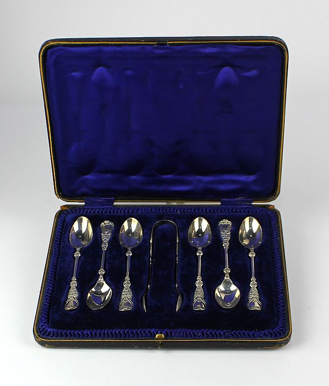 A cased set of six Edwardian Art Nouveau silver teaspoons and sugar tongs, by Joseph Rodgers & Son Ltd., Sheffield, 1906, gross weight 3.5oz