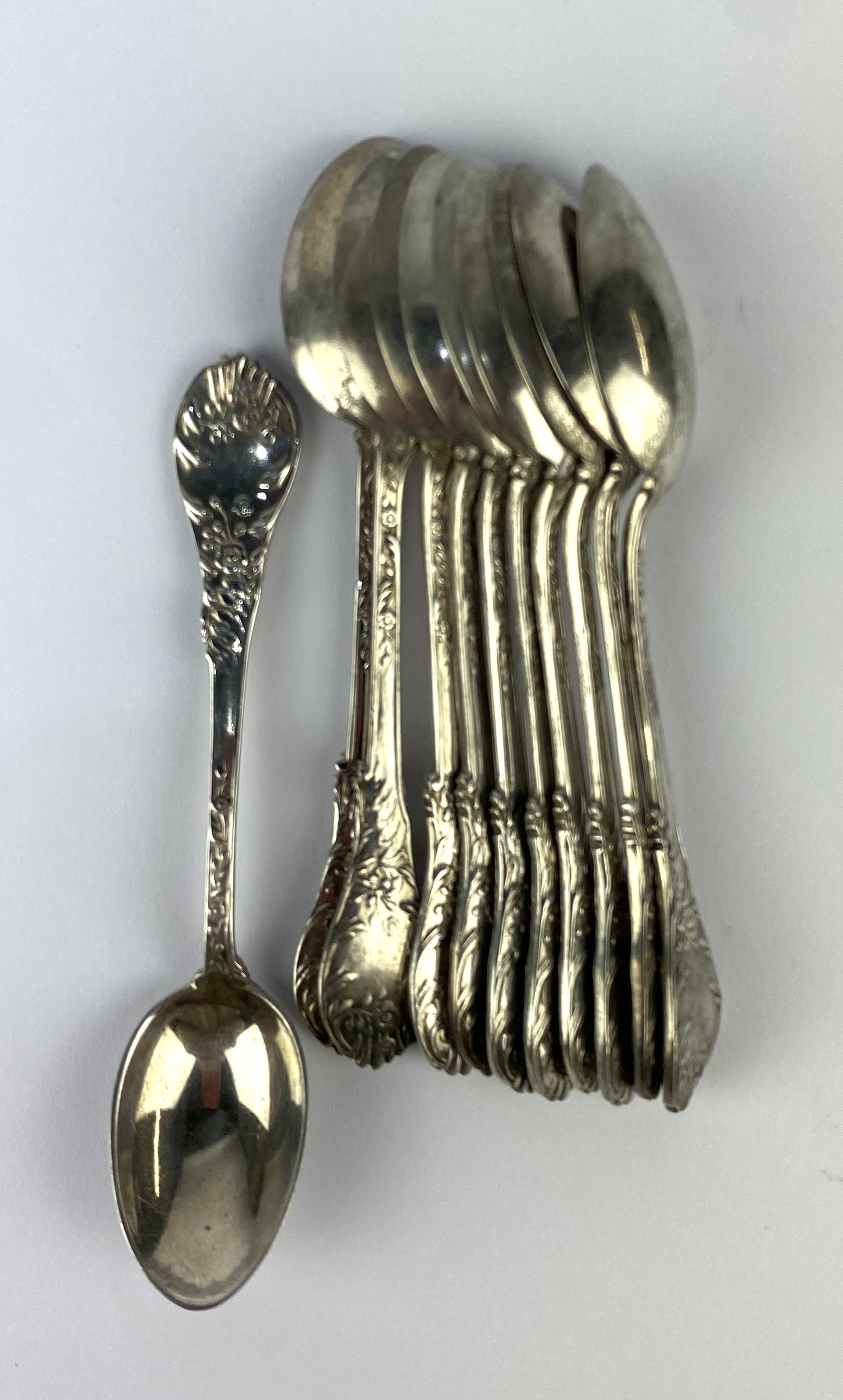A set of eleven foliate cast silver tea spoons, London 1903, 5 ozs.