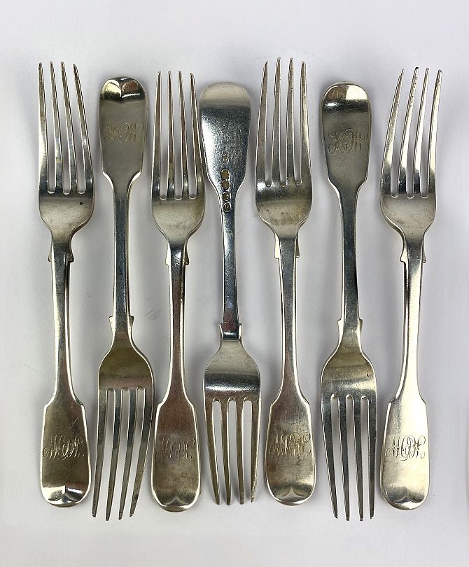 A matched set of seven fiddle patten table forks, London 1845 and 1853, 11.25 ozs combined.