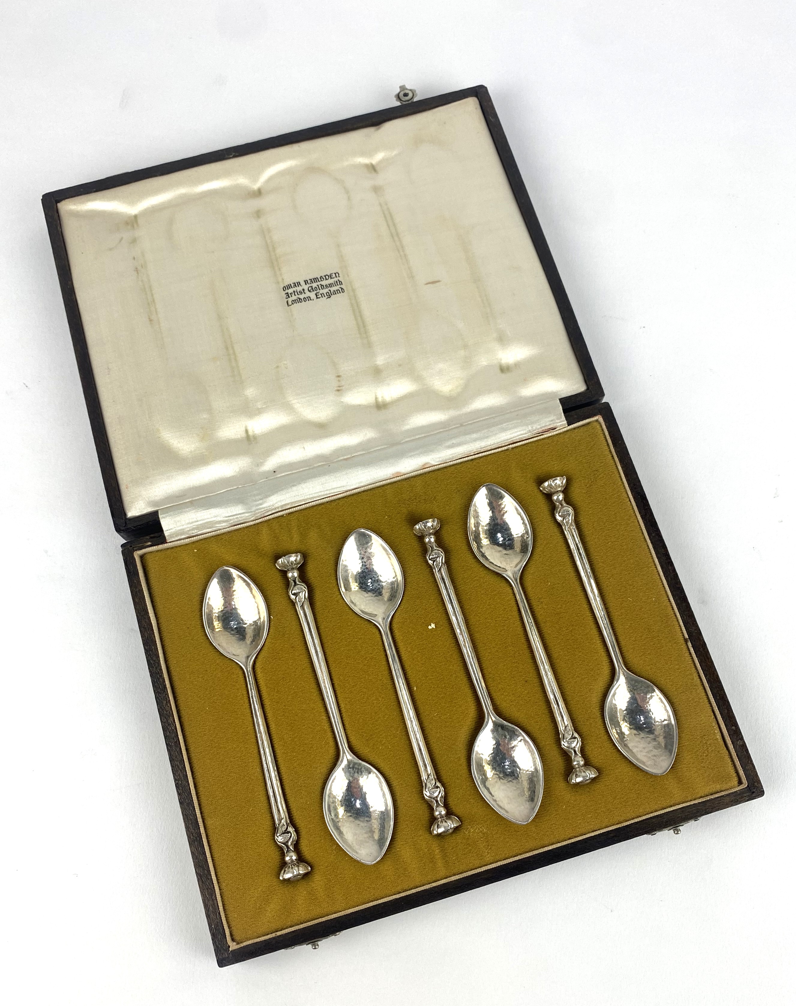 A set of six Arts & Crafts silver spoons, maker Omar Ramsden, London 1935, with hammered decoration, stem handle and rose finial, length 11.2cm, 4oz, in fitted case