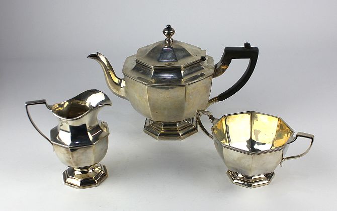 An Edwardian three piece silver tea service, of octagonal form, maker Thomas Bradbury & Sons, London 1906, the teapot with ebonised handle, 19cm high, combined gross weight 35.8oz