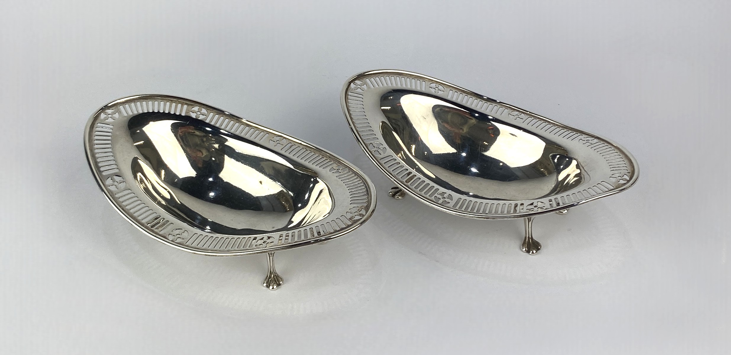 A pair of Edwardian silver bon bon dishes, by Samuel Walton Smith, London, 1910, of oval form, with decorative pierced rims, raised on four paw feet, width 16.2cm, 7oz (2)