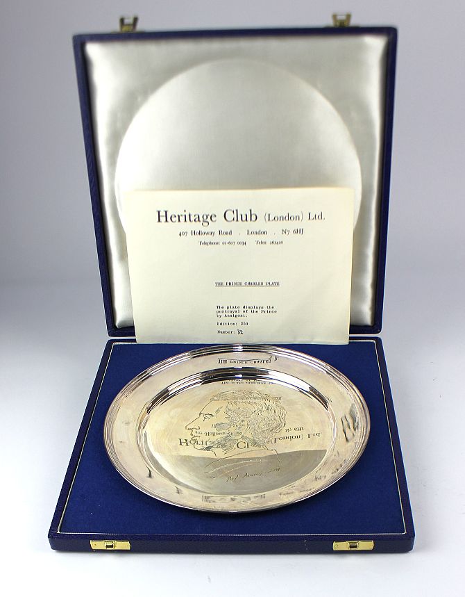 A silver limited edition Annigoni Prince Charles plate, Sheffield, 1980, engraved centrally with portrait, edition 32 of 250, cased with certificate, diameter 22.7cm, 7.9oz