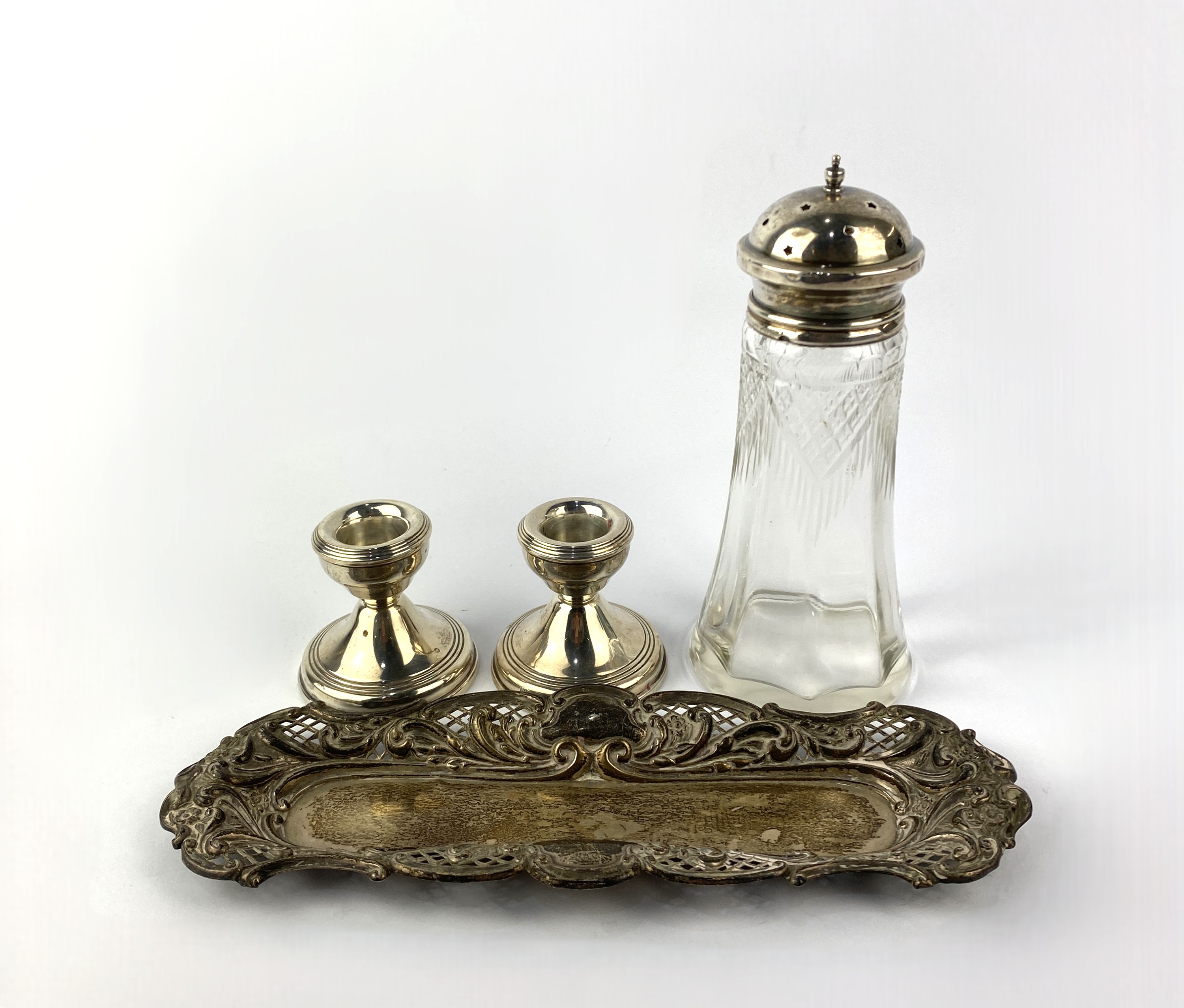 A George V silver topped cut glass sugar sifter, by Henry Perkins & Son London, 1924, height 17.5cm, a pair of Elizabeth II dwarf silver candlesticks, by Robert Pringle & Son, Birmingham, 1965, of circular form, with weighted bases, height 6cm, together with an Edwardian silver pen tray, with pierced embossed border, marks rubbed, width 25cm (4)