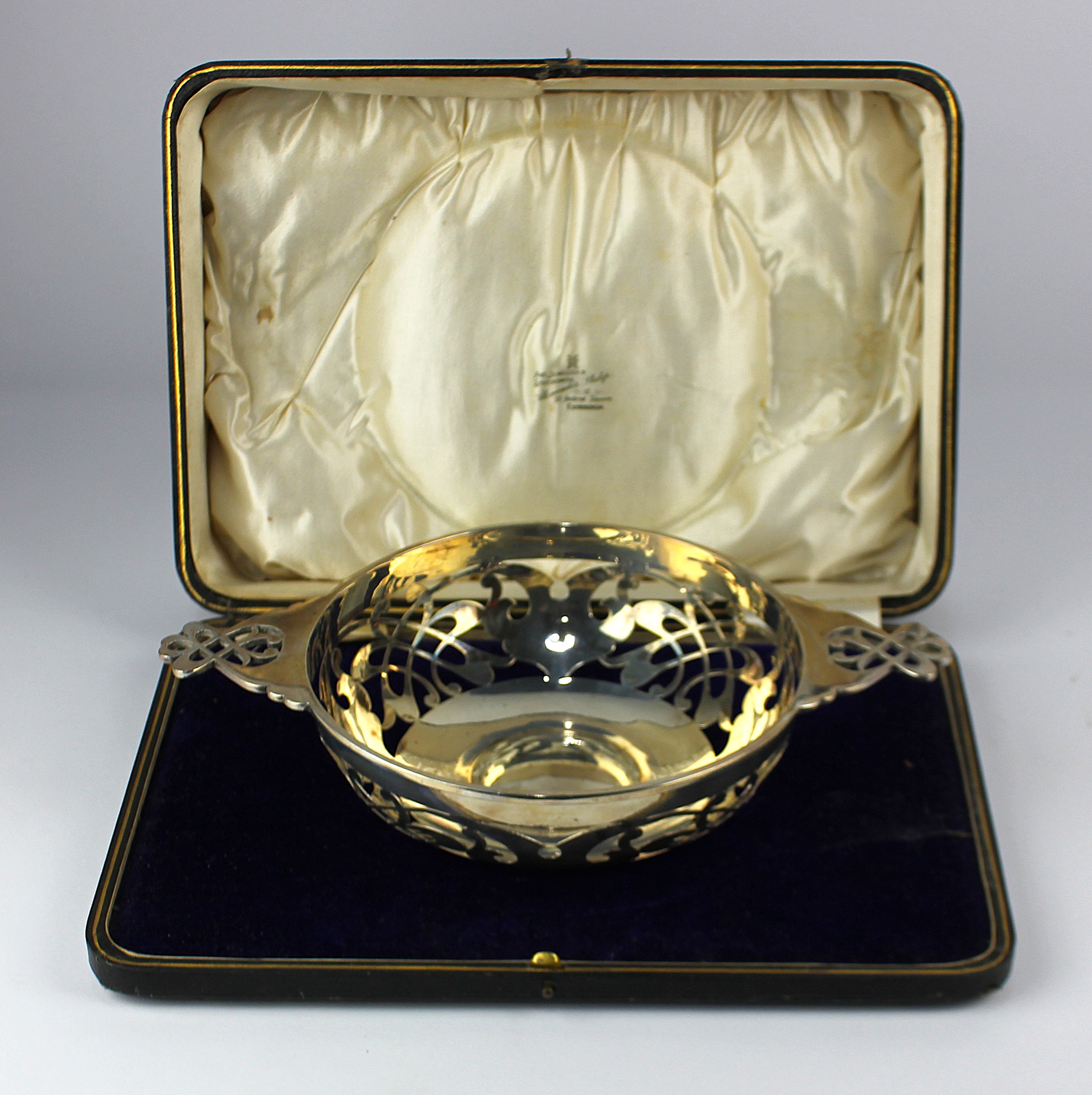 A George V pierced silver bowl, by Martin Hall & Co., Sheffield, 1915, two handled, of quaich form, with Celtic inspired design, within 'Alexander Philip, St. Andrew Square, Edinburgh' retailers fitted case, width 26.5cm, 11.3oz