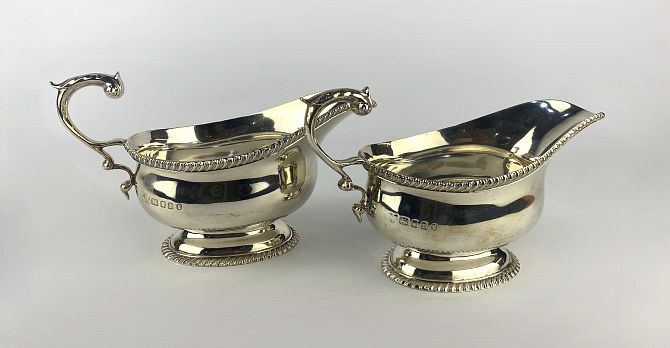 A pair of George V silver sauce boats, makers marks rubbed, London, 1934 (Jubilee hallmark), in the Georgian style, gadrooned rim and foot, scroll thumbpiece, bearing 'Harrods, London, S.W' stamp to bases, height 10cm, 22.6oz
