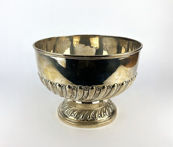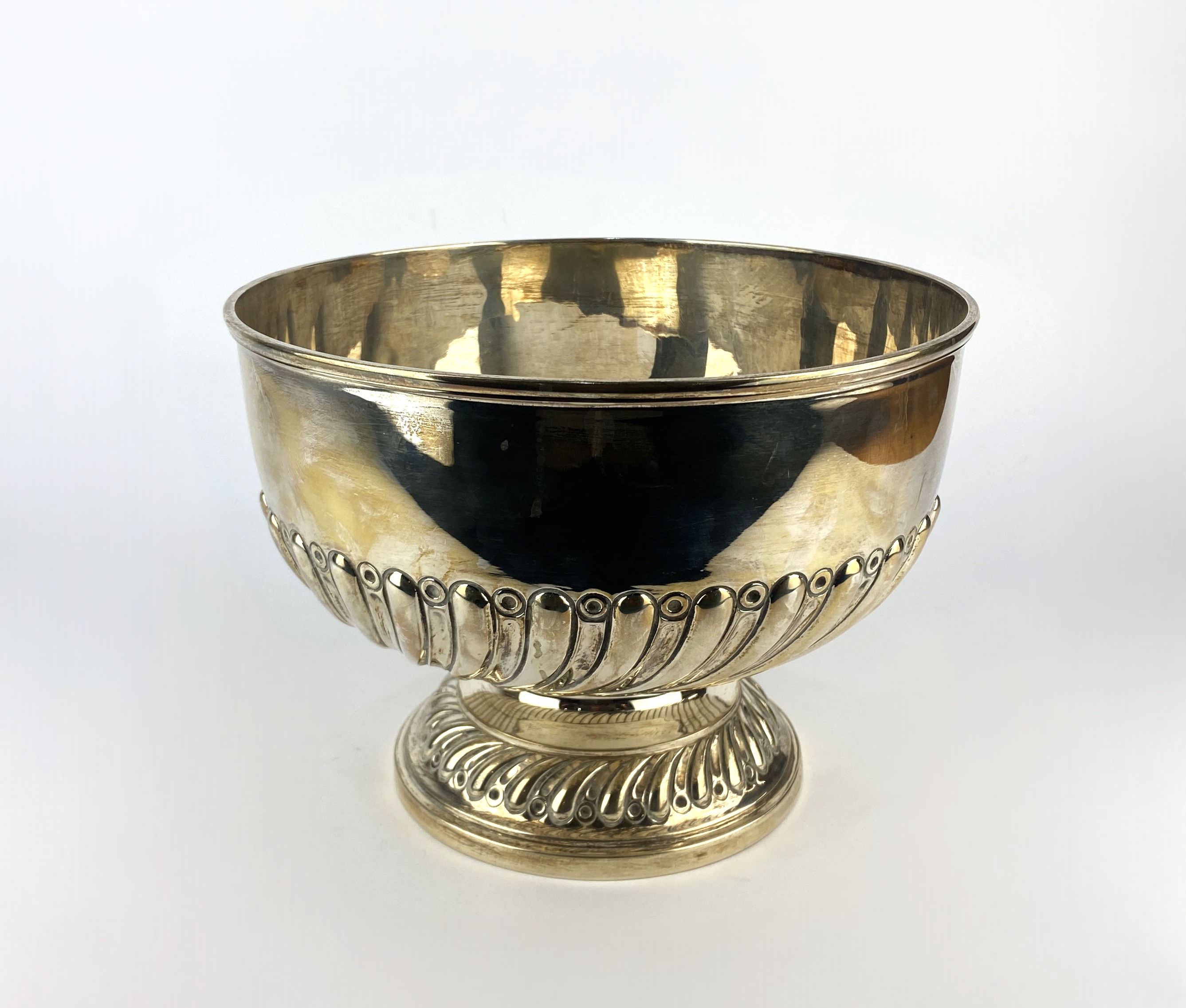 A George V silver punch bowl, by W. & F. Rabone, Birmingham, 1913, on circular foot, with demi fluted bowl and foot, reeded rim, diameter 22.75cm, 27.1oz