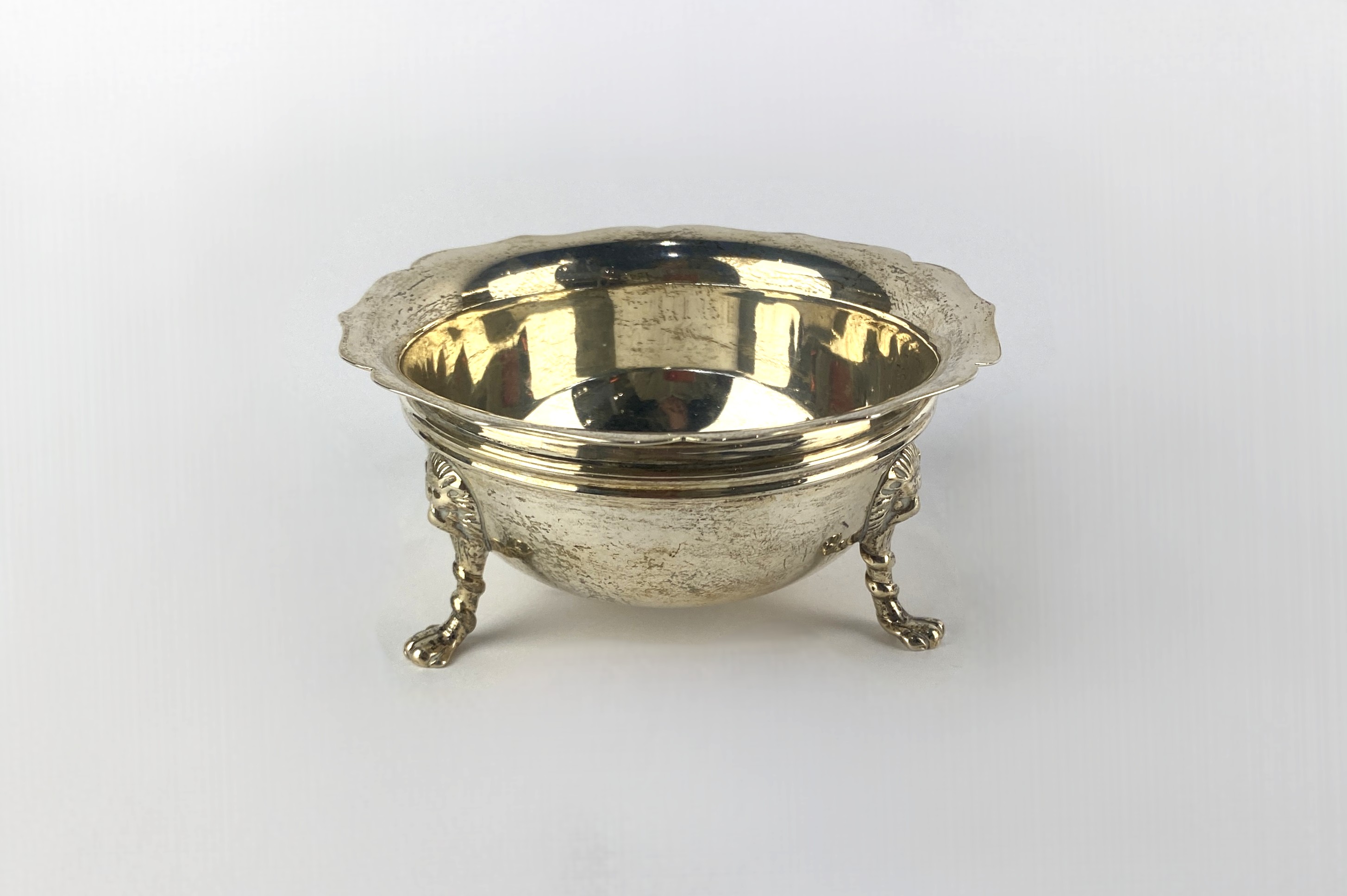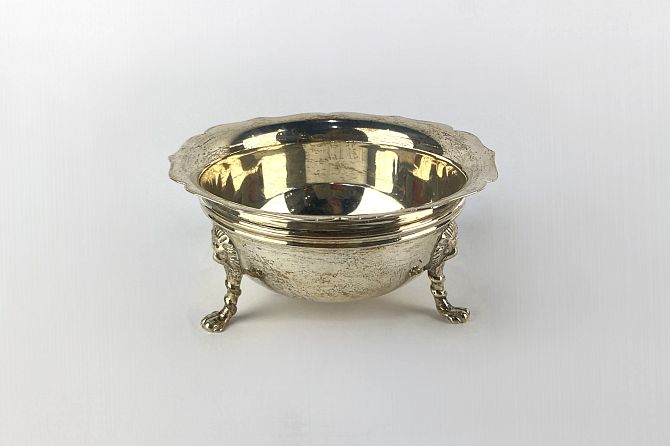 A George V silver sugar bowl, makers mark rubbed, London, 1915, with shaped rim, on three lions mask and paw feet, diameter 11cm, 4.2oz
